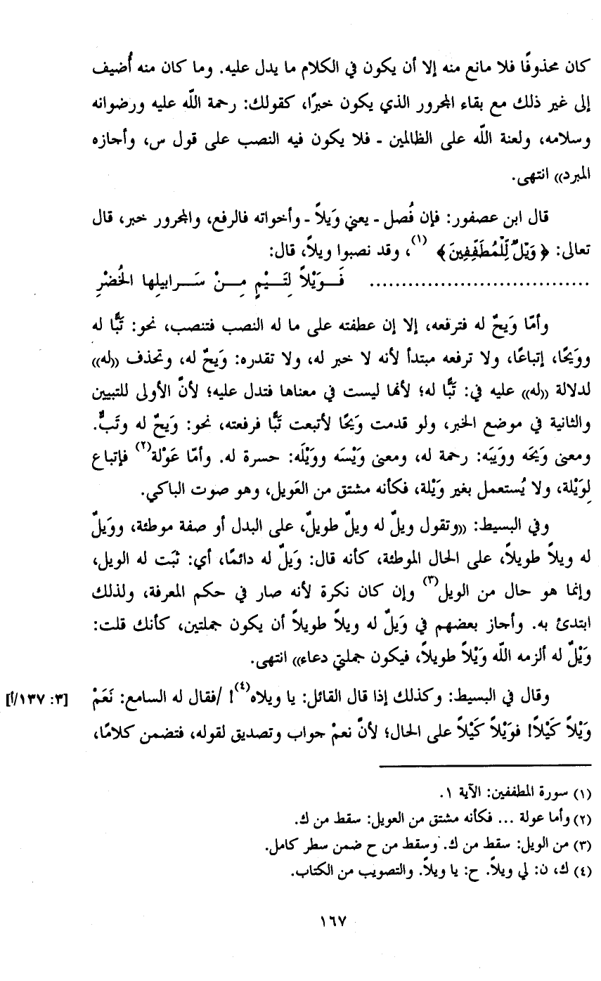 قال ابن عصفور: فإن فصل - يعني ويلا- وأخواته فالرفع، والمجرور خبر، قال تعالى: {وَيْلٌ لِلْمُطَفِّفِينَ}، وقد نصبوا ويلا، قال: