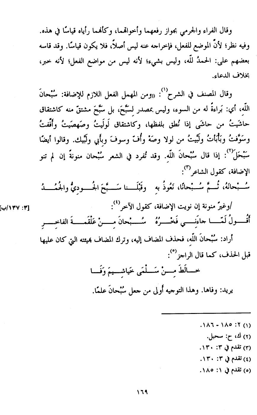 وقال المصنف في الشرح: ((ومن المهمل الفعل اللازم للإضافة: سبحان الله، أي: براءة له من السوء، ولبس بمصدر لسبح، بل سبح مشتق منه كاشتقاق حاشيت من حاشى إذا نطق بلفظها، وكاشتقاق لوليت وصهصيت وأففت وسوفت وبأبأت ولبيت من لولا وصة وأف وسوف وبأبي ولبيك. وقالوا أيضا سبحل: إذا قال سبحان الله. وقد تفرد في الشعر سبحان منونة إن لم تنو الإضافة، كقول الشاعر:
