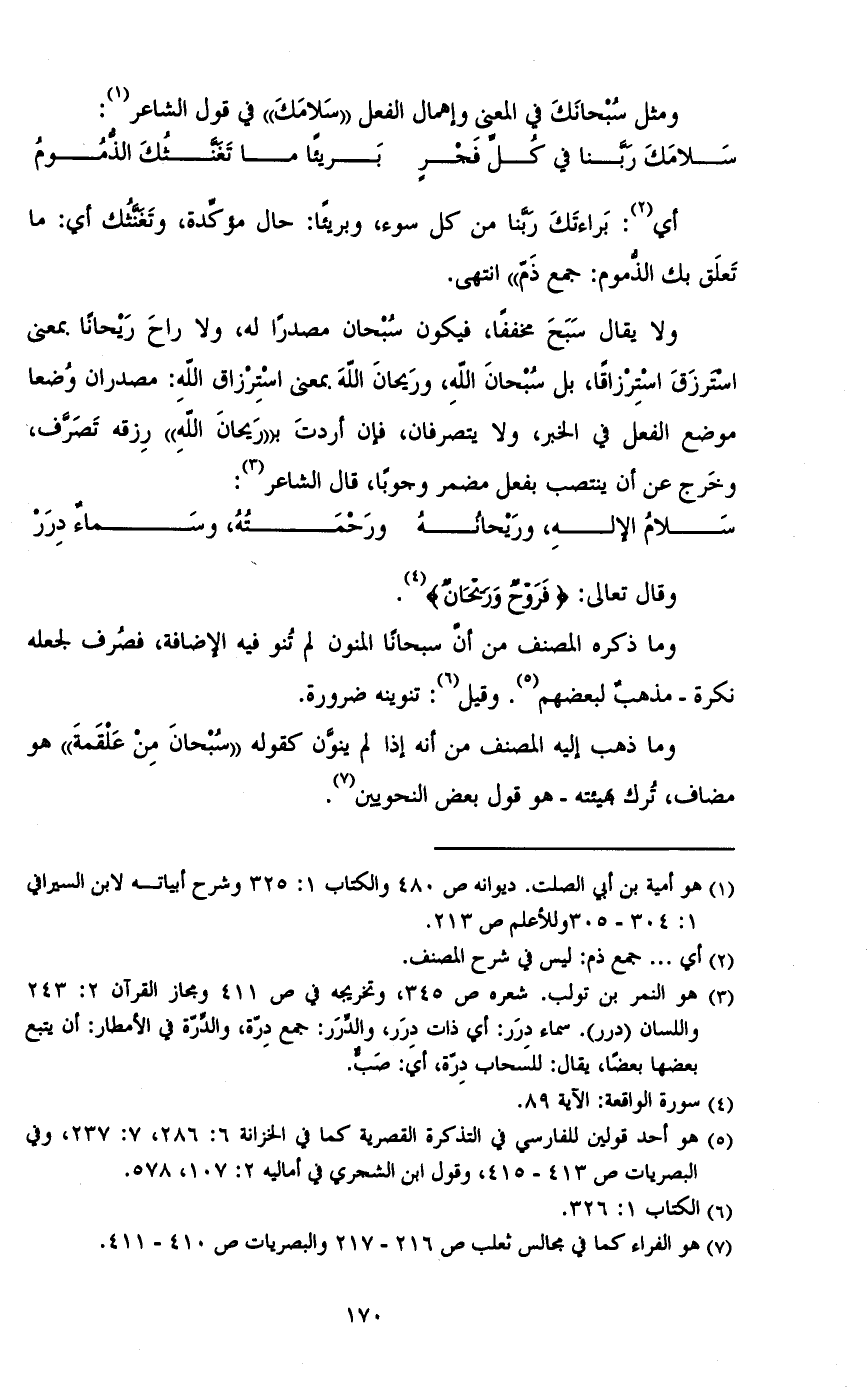 وما ذكره المصنف من أن سبحانا المنون لم تنو فيه الاضافة، فصرف لجعله نكرة - مذهب لبعضهم وقيل: تنوينه ضرورة.