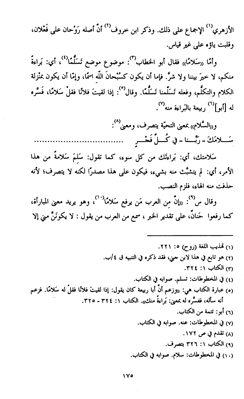 منكم، لا خير بيننا ولا شر. فإما أن يكون كسبحان الله اسما، وإما أن يكون بمنزلة الكلام والتكلم، وفعله تسلمنا تسلما. وقال: إذا لقيت فلانا فقل سلاما، فسره