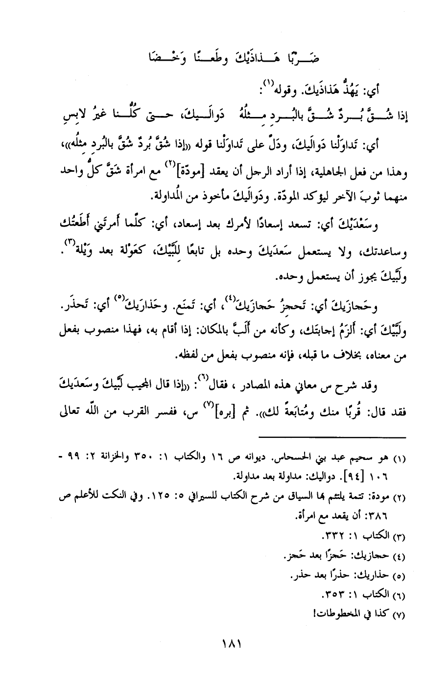 وقد شرح س معاني هذه المصادر، فقال: ((وإذا قال المجيب لبيك وسعديك فقد قال: قربا منك ومتابعة لك)). ثم [بره] س، ففسر القرب من الله تعالى