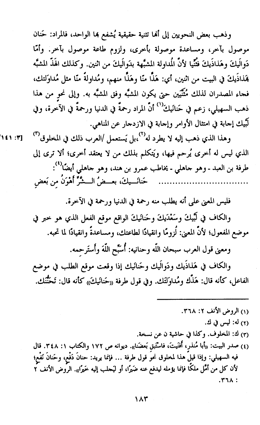 وذهب بعض النحويين إلى ألها تثنية حقيقية يشفع بها الواحد، فالمراد: حنان موصول بآخر، ومساعدة موصولة بأخرى، ولزوم طاعة موصول بآخر. وأما دواليك وهذاذيك فثنيا لأن المدوالة المشبهة بداوليك من اثنين. وكذلك الهذ المشبه بهذاذيك في البيت من اثنين، أي: هذا منا وهذا منهم، ومداولة منا مثل مداولتك، فجاء المصدران لذلك مثنيين حتى يكون المشبه وفق المشبه به. وإلى نحو من هذا ذهب السهيلي، زعم في حنانيك أن المراد رحمة في الدنيا ورحمة في الآخرة، وفي لبيك إجابة في امتثال الأوامر وإجابة في الازدجار عن المناهي.