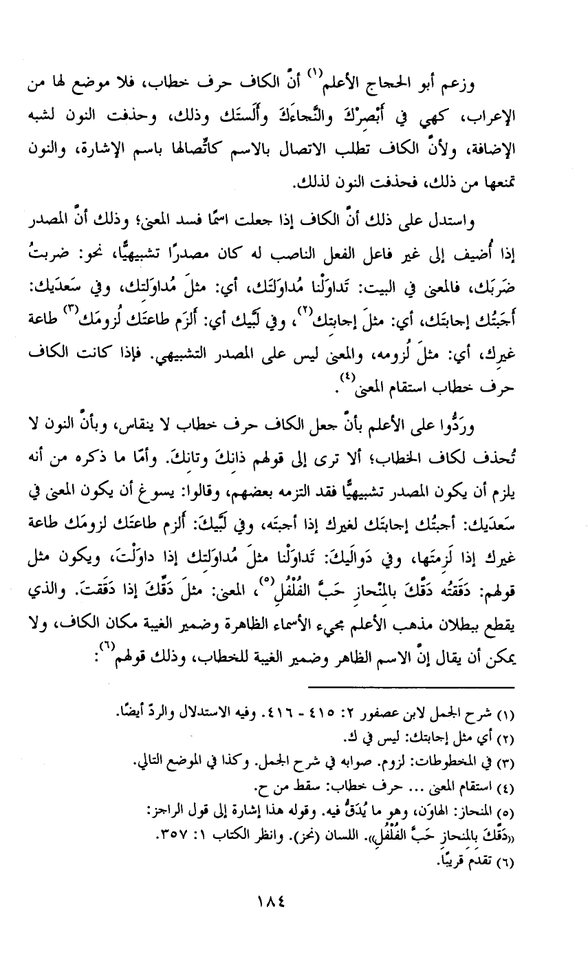 وزعم أبو الحجاج الأعلم أن الكاف حرف خطاب، فلا موضع لها من الإعراب، كهي في أبصرك والنجاءك وألستك وذلك، وحذفت النون لشبه الإضافة، ولأن الكاف تطلب الاتصال بالاسم كاتصالها باسم الإشارة، والنون تمنعها من ذلك، فحذفت النون لذلك.
