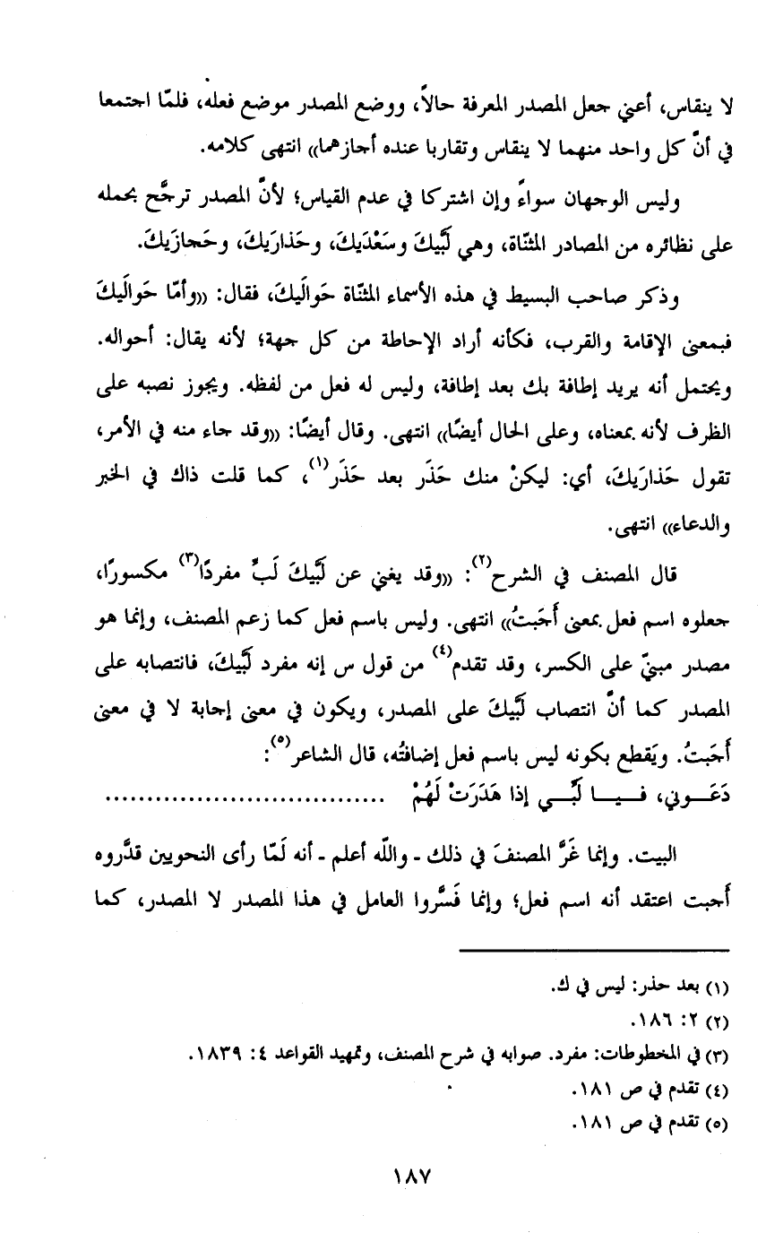 وليس الوجهان سواء وإن اشتركا في عدم القياس؛ لأن المصدر ترجح بحمله على نظائره من المصادر المثناة، وهي لبيك وسعديك، وحذاريك، وحجازيك.