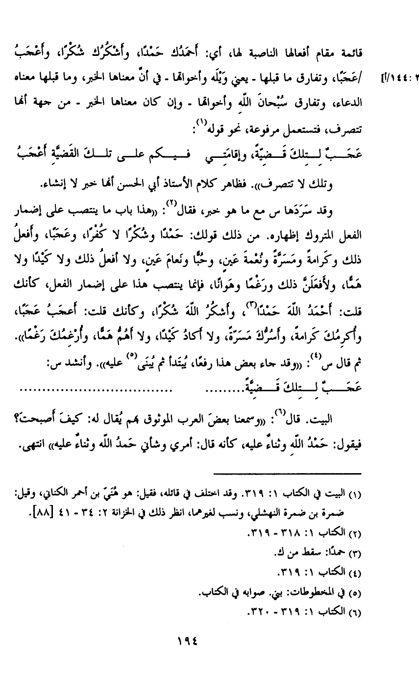 البيت. قال: «وسمعنا بعض العرب الموثوق بهم يقال له: كيف أصبحت؟ فيقول: حمد الله وثناء عليه، كأنه قال: أمري وشأني حمد الله وثناء عليه» انتهى.