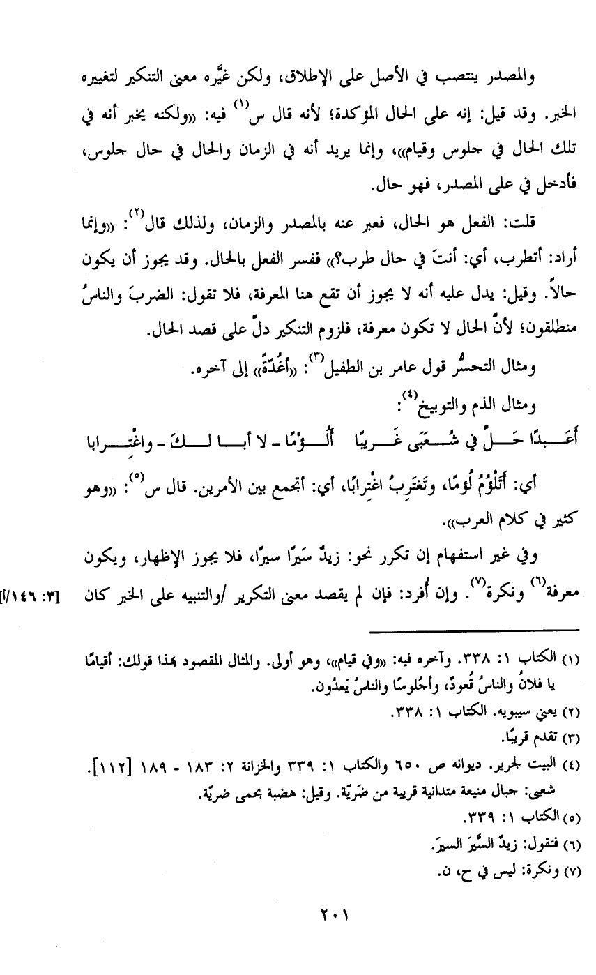 قلت: الفعل هو الحال، فعبر عنه بالمصدر والزمان، ولذلك قال: «وإنما أراد: أتطرب، أي: أنت في حال طرب؟» ففسر الفعل بالحال. وقد يجوز أن يكون حالاً. وقيل: يدل عليه أنه لا يجوز أن تقع هنا المعرفة، فلا تقول: الضرب والناس منطلقون؛ لأن الحال لا تكون معرفة، فلزوم التنكير دل على قصد الحال.