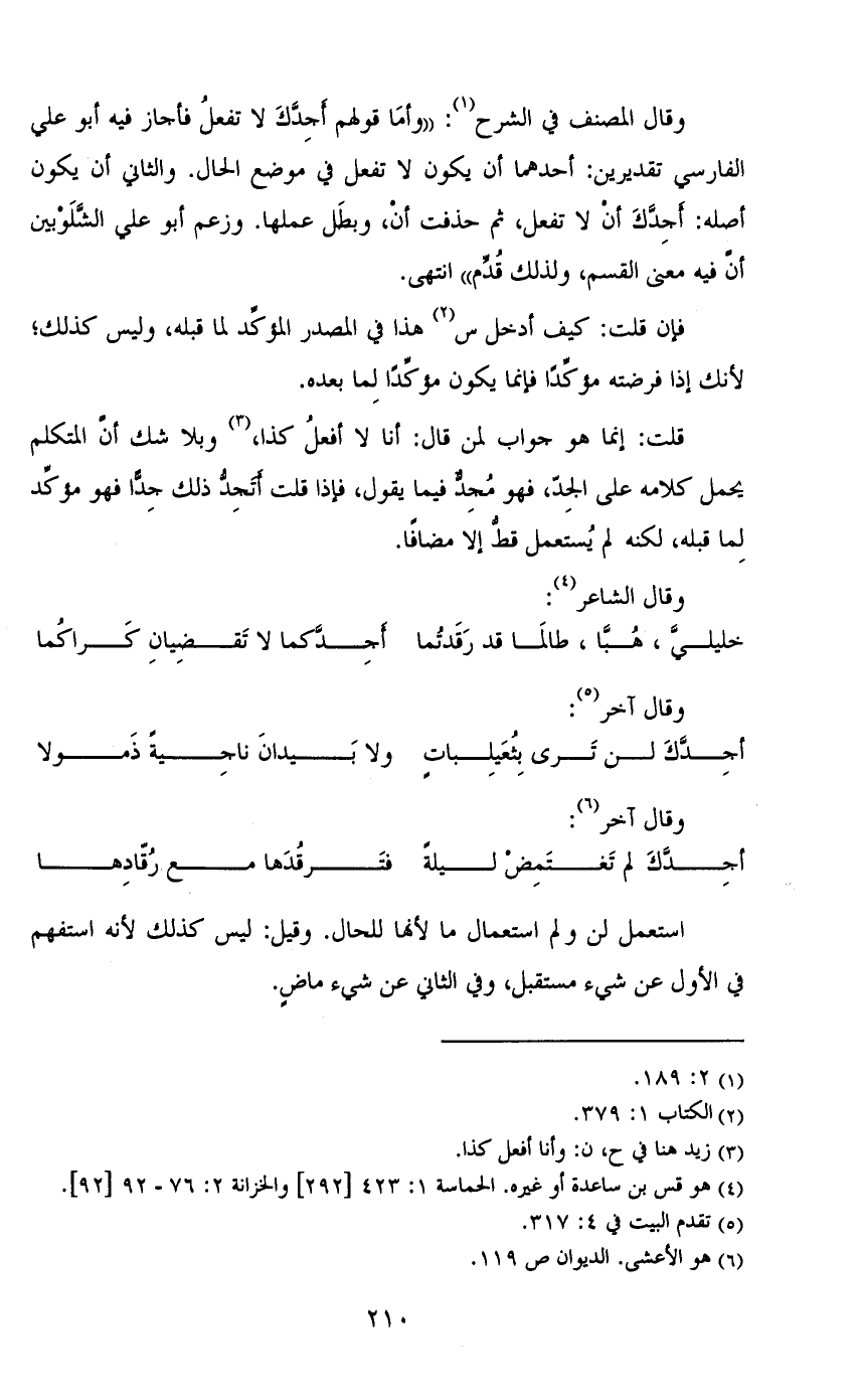 وقال المصنف في الشرح: «وأما قولهم أجدك لا تفعل فأجاز فيه أبو علي الفارسي تقديرين: أحدهما أن يكون لا تفعل في موضع الحال. والثاني أن يكون أصله: أجدك أن لا تفعل، ثم حذفت أن، وبطل عملها. وزعم أبو علي الشلوبين أن فيه معنى القسم، ولذلك قدم» انتهى.