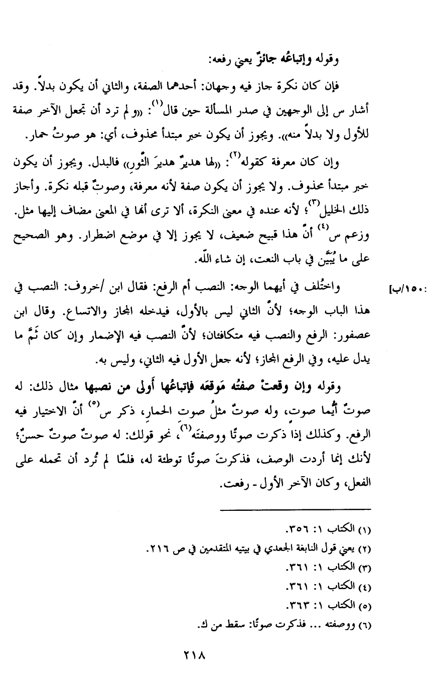 وإن كان معرفة كقوله: «لها هدير هدير الثور» فالبدل. ويجوز أن يكون خبر مبتدأ محذوف. ولا يجوز أن يكون صفة لأنه معرفة، وصوت قبله نكره. وأجاز ذلك الخليل؛ لأنه عنده في معنى النكرة، ألا ترى أنها في المعنى مضاف إليها مثل. وزعم س أن هذا قبيح ضعيف، لا يجوز إلا في موضع اضطرار. وهو الصحيح على ما يبين في باب النعت، إن شاء الله.