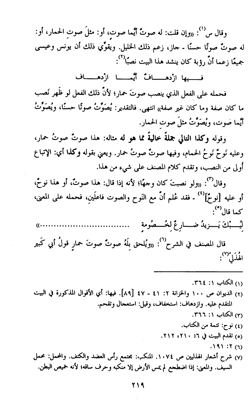 وقال س: «وإن قلت: له صوت أيما صوت، أو: مثل صوت الحمار، أو: له صوت صوتاً حسناً- جاز، زعم ذلك الخليل. ويقوي ذلك أن يونس وعيسى جميعاً زعما أن رؤبة كان ينشد هذا البيت نصباً: