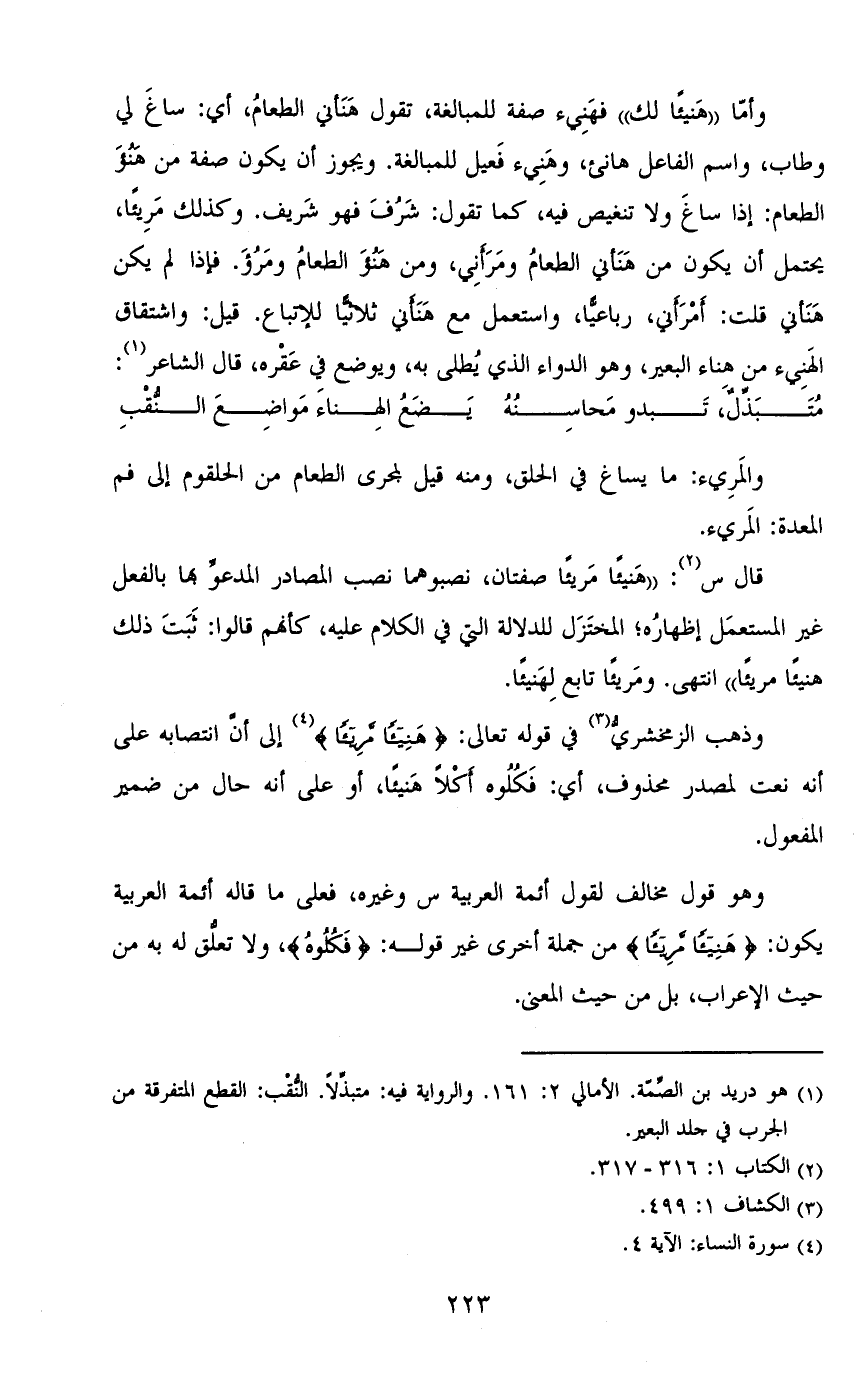 وأما «هنيئاً لك» فهنيء صفة للمبالغة، تقول هنأني الطعام، أي: ساغ لي وطاب، واسم الفاعل هاناء، وهنيء فعيل للمبالغة. ويجوز أن يكون صفة من هنؤ الطعام: إذا ساغ ولا تنغيص فيه، كما تقول: شرف فهو شريف. وكذلك مريئاً، يحتمل أن يكون من هنأني الطعام ومرأني، ومن هنؤ الطعام ومرؤ. فإذا لم يكن هنأني قلت: أمرأني، رباعياً، واستعمل مع هنأني ثلاثياً للإتباع. قيل: واشتقاق الهنيء من هناء البعير، وهو الدواء الذي يطلى به، ويوضع في عقره، قال الشاعر: