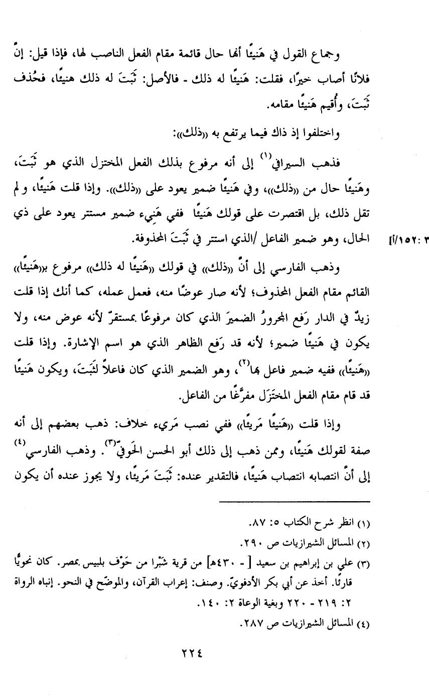فذهب السيرافي إلى أنه مرفوع بذلك الفعل المختزل الذي هو ثبت، وهنيئاً حال من «ذلك»، وفي هنيئاً ضمير يعود على «ذلك». وإذا قلت هنيئاً، ولم تقل ذلك، بل اقتصرت على قولك هنيئاً ففي هنيء ضمير مستتر يعود على ذي الحال، وهو ضمير الفاعل/الذي استتر في ثبت المحذوفة.