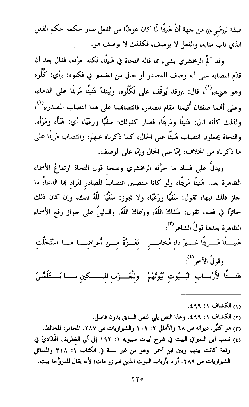 وقد ألم الزمخشري بشيء مما قاله النحاة في هنيئاً، لكنه حرفه، فقال بعد أن قدم انتصابه على أنه وصف للمصدر أو حال من الضمير في فكلوه: «أي: كلوه وهو هنيء»، قال: «وقد يوقف على فكلوه، ويبتدأ هنيئاً مريئاً على الدعاء، وعلى أنهما صفتان أقيمتا مقام المصدر، فانتصابهما على هذا انتصاب المصدر»، ولذلك كأنه قال: هنيئاً ومريئاً، فصار كقولك: سقياً ورعياً، أي: هنأه ومرأه. والنحاة يجعلون انتصاب هنيئاً على الحال، كما ذكرناه عنهم، وانتصاب مريئاً على ما ذكرناه من الخلاف، إما على الحال وإما على الوصف.