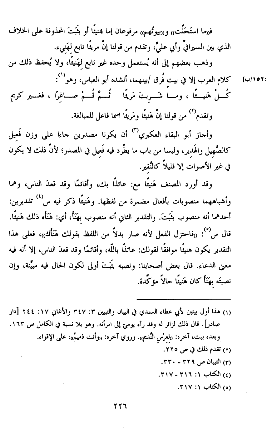 وقد أورد المصنف هنيئاً مع: عائذاً بك، وأقائماً وقد قعد الناس، وهما وأشباههما منصوبات بأفعال مضمرة من لفظها. وهنيئاً ذكر فيه س تقديرين: أحدهما أنه منصوب بثبت. والتقدير الثاني أنه منصوب بهنأ، أي: هنأه ذلك هنيئاً. قال س: «فاختزل الفعل لأنه صار بدلاً من اللفظ بقولك هنأك»، فعلى هذا التقدير يكون هنيئاً موافقاً لقولك: عائذاً بالله، وأقائماً وقد قعد الناس، إلا أنه فيه معنى الدعاء. قال بعض أصحابنا: ونصبه بثبت أولى لكون الحال فيه مبينة، وإن نصبته بهنأ كان هنيئاً حالاً مؤكدة.