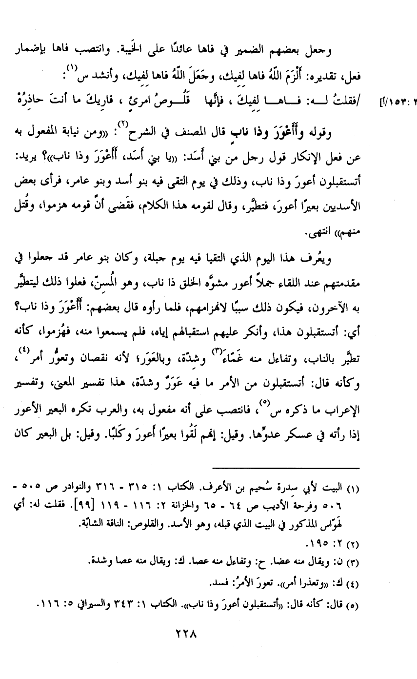 وقوله وأأعور وذا ناب قال المصنف في الشرح: «ومن نيابة المفعول به عن فعل الإنكار قول رجل من بني أسد: «يا بني أسد، أأعور وذا ناب»؟ يريد: أتستقبلون أعور وذا ناب، وذلك في يوم التقى فيه بنو أسد وبنو عامر، فرأى بعض الأسديين بعيراً أعور، فتطير، وقال لقومه هذا الكلام، فقضى أن قومه هزموا، وقتل منهم» انتهى.