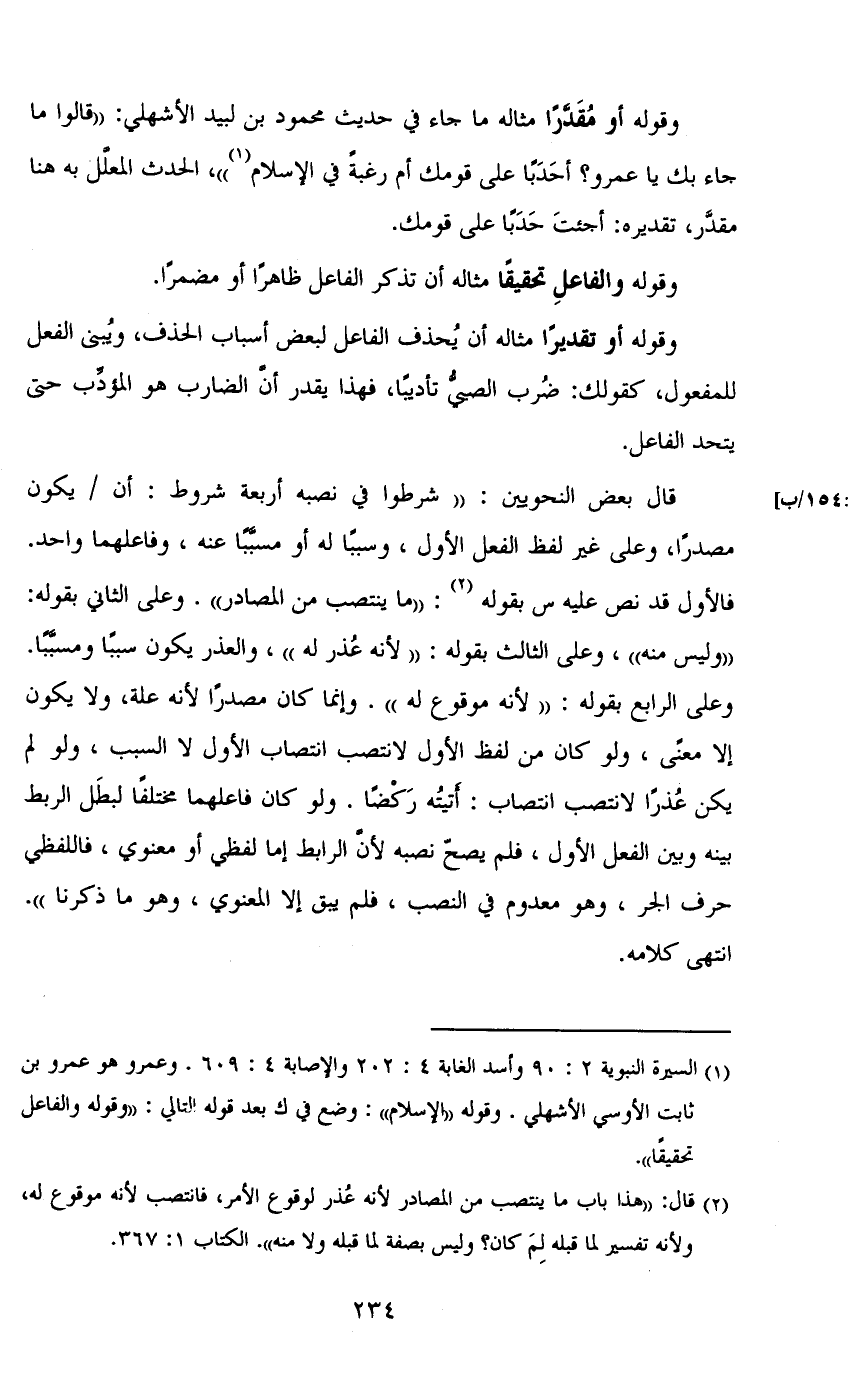 قال بعض النحويين: «شرطوا في نصبه أربعة شروط: أن / يكون مصدراً، وعلى غير لفظ الفعل الأول، وسبباً له أو مسبباً عنه، وفاعلهما واحد. فالأول قد نص عليه س بقوله: «ما ينتصب من المصادر». وعلى الثاني بقوله: «وليس منه»، وعلى الثالث بقوله: «لأنه عذر له»، والعذر يكون سبباً ومسبباً. وعلى الرابع بقوله: «لأنه موقوع له». وإنما كان مصدراً لأنه علة، ولا يكون إلا معنى، ولو كان من لفظ الأول لانتصب انتصاب الأول لا السبب، ولو لم يكن عذراً لانتصب انتصاب: أتيته ركضاً. ولو كان فاعلهما مختلفاً لبطل الربط بينه وبين الفعل الأول، فلم يصح نصبه لأن الرابط إما لفظي أو معنوي، فاللفظي حرف الجر، وهو معدوم في النصب، فلم يبق إلا المعنوي، وهو ما ذكرنا». انتهى كلامه.
