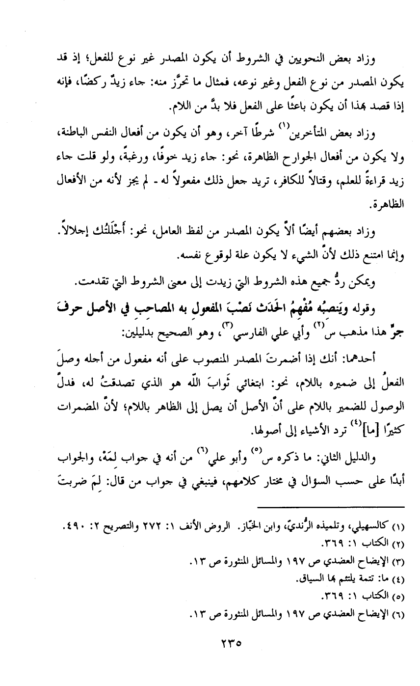 وزاد بعض المتأخرين شرطاً آخر، وهو أن يكون من أفعال النفس الباطنة، ولا يكون من أفعال الجوارح الظاهرة، نحو: جاء زيد خوفاً، ورغبة، ولو قلت جاء زيد قراءة للعلم، وقتالاً للكافر، تريد جعل ذلك مفعولاً له- لم يجز لأنه من الأفعال الظاهرة.