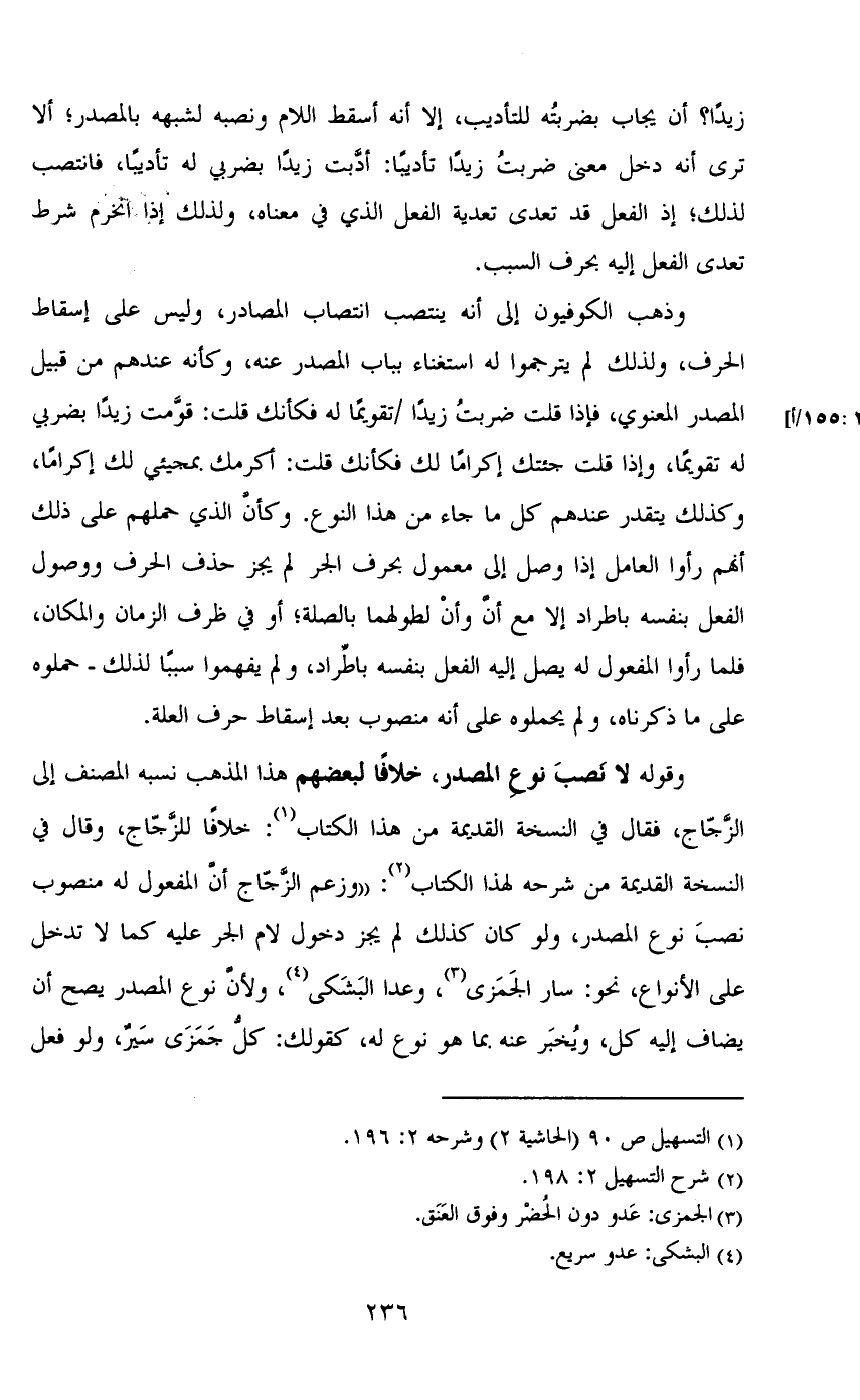 وقوله لا نصب نوع المصدر، خلافاً لبعضهم هذا المذهب نسبه المصنف إلى الزجاج، فقال في النسخة القديمة من هذا الكتاب: خلافاً للزجاج، وقال في النسخة القديمة من شرحه لهذا الكتاب: «وزعم الزجاج أن المفعول له منصوب نصب نوع المصدر، ولو كان كذلك لم يجز دخول لام الجر عليه كما لا تدخل على الأنواع، نحو: سار الجمزى، وعدا البشكى، ولأن نوع المصدر يصح أن يضاف إليه كل، ويخبر عنه بما هو نوع له، كقولك: كل جمزى سير، ولو فعل