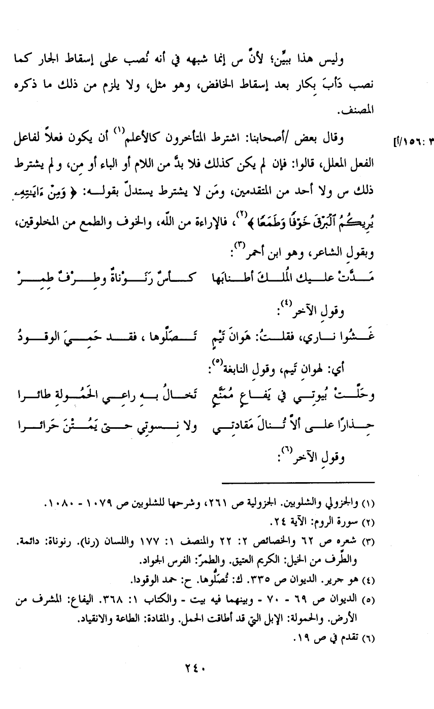 وقال بعض /أصحابنا: اشترط المتأخرون كالأعلم أن يكون فعلاً لفاعل الفعل المعلل، قالوا: فإن لم يكن كذلك فلا بد من اللام أو الباء أو من، ولم يشترط ذلك س ولا أحد من المتقدمين، ومن لا يشترط يستدل بقوله: {وَمِنْ آيَاتِهِ يُرِيكُمُ الْبَرْقَ خَوْفًا وَطَمَعًا}، فالإراءة من الله، والخوف والطمع من المخلوقين، وبقول الشاعر، وهو ابن أحمر: