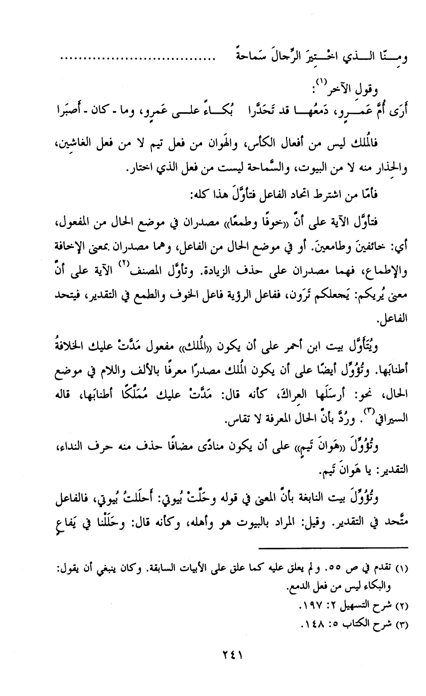 فتأول الآية على أن «خوفاً وطمعاً» مصدران في موضع الحال من المفعول، أي: خائفين وطامعين. أو في موضع الحال من الفاعل، وهما مصدران بمعنى الإخافة والإطماع، فهما مصدران على حذف الزيادة. وتأول المصنف الآية على أن معنى يريكم: يجعلكم ترون، ففاعل الرؤية فاعل الخوف والطمع في التقدير، فيتحد الفاعل.