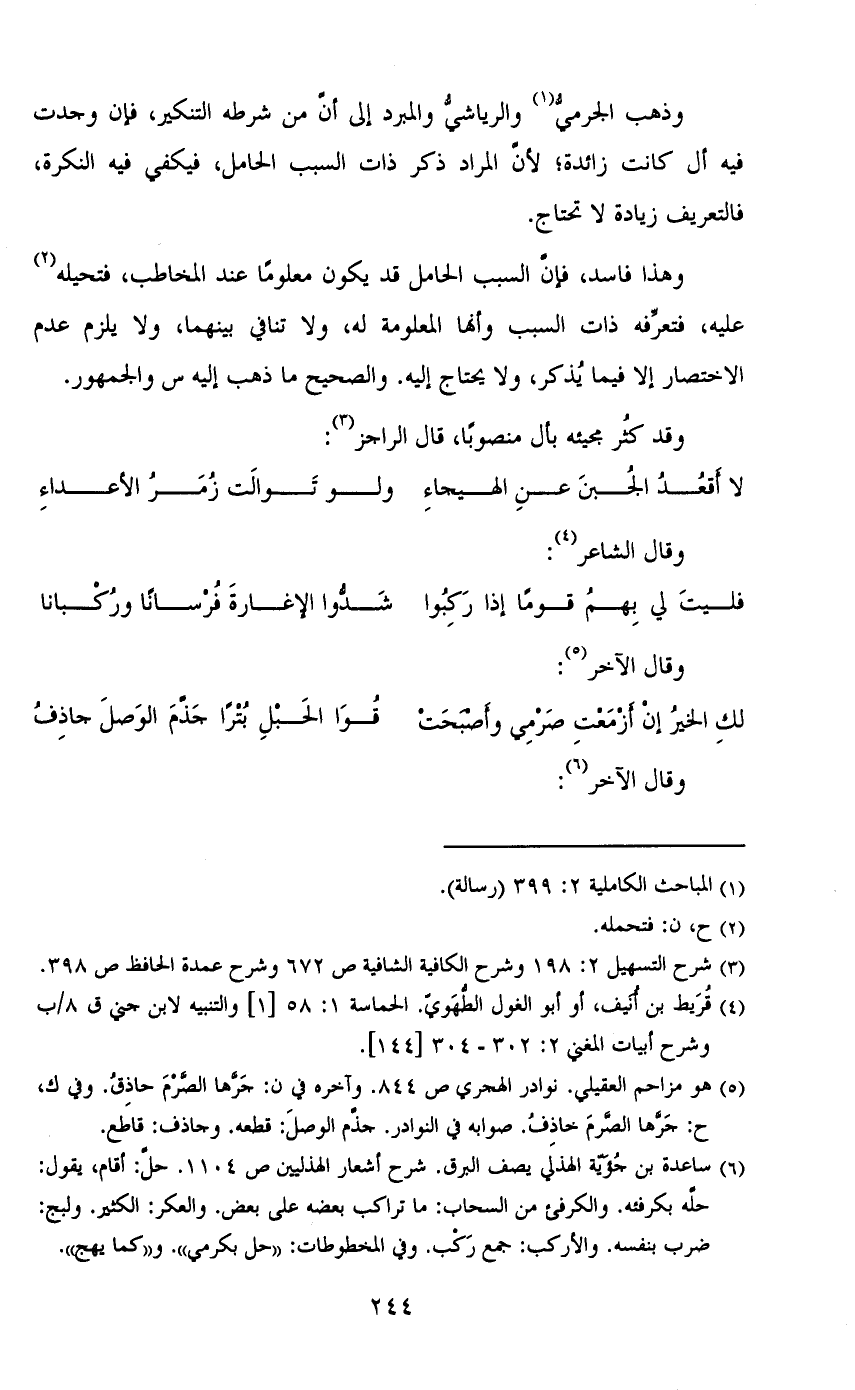 وذهب الجرمي والرياشي والمبرد إلى أن من شرطه التنكير، فإن وجدت فيه أل كانت زائدة؛ لأن المراد ذكر ذات السبب الحامل، فيكفي فيه النكرة، فالتعريف زيادة لا تحتاج.