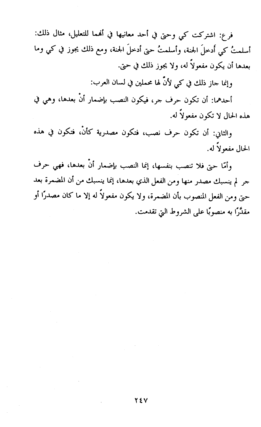 وأما حتى فلا تنصب بنفسها، إنما النصب بإضمار أن بعدها، فهي حرف جر لم ينسبك مصدر منها ومن الفعل الذي بعدها، إنما ينسبك من أن المضمرة بعد حتى ومن الفعل المنصوب بأن المضمرة، ولا يكون مفعولاً له إلا ما كان مصدراً أو مقدراً به منصوباً على الشروط التي تقدمت.