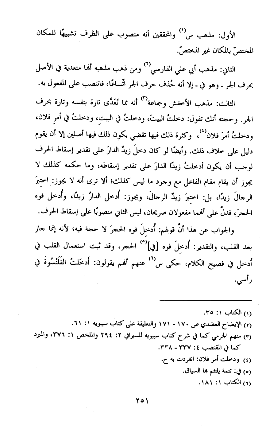 الأول: مذهب س والمحققين أنه منصوب على الظرف تشبيهاً للمكان المختص بالمكان غير المختص.