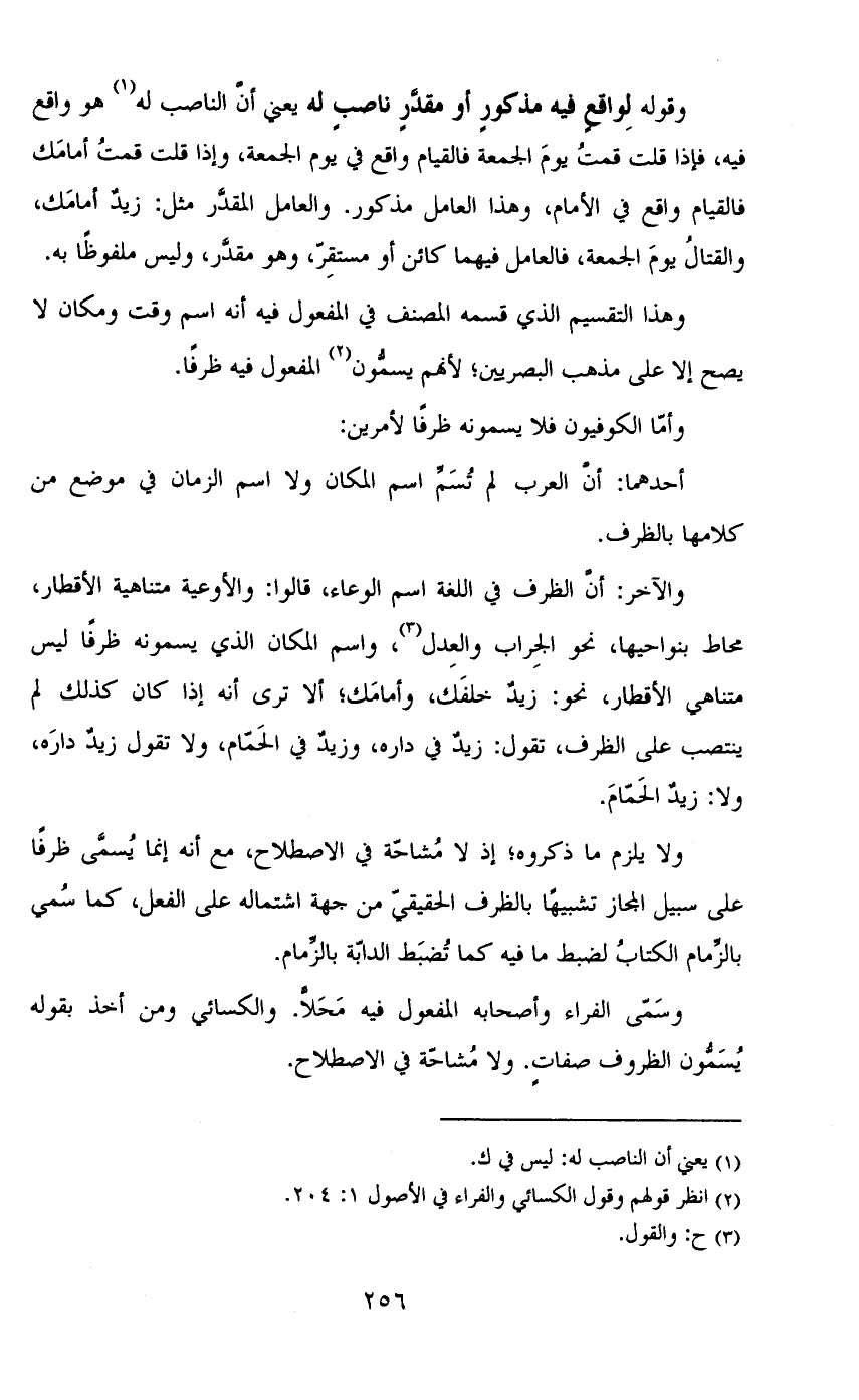 وسمى الفراء وأصحابه المفعول فيه محلاً. والكسائي ومن أخذ بقوله يسمون الظروف صفات. ولا مشاحة في الاصطلاح.