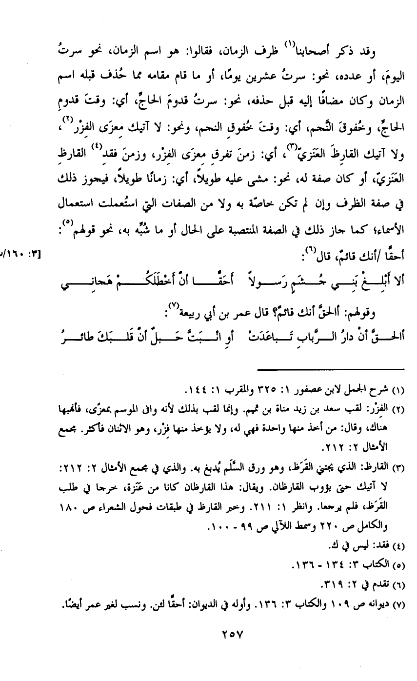 وقد ذكر أصحابنا ظرف الزمان, فقالوا: هو اسم الزمان، نحو سرت اليوم، أو عدده، نحو: سرت عشرين يوماً، أو ما قام مقامه مما حذف قبله اسم الزمان وكان مضافاً إليه قبل حذفه، نحو: سرت قدوم الحاج، أي: وقت قدوم الحاج، وخفوق النجم، أي: وقت خفوق النجم، ونحو: لا آتيك معزى الفزر، ولا آتيك القارظ العنزي, أي: زمن تفرق معزى الفزر، وزمن فقد القارظ العنزي، أو كان صفة له، نحو: مشى عليه طويلاً, أي: زماناً طويلاً، فيجوز ذلك في صفة الظرف وإن لم تكن خاصة به ولا من الصفات التي استعملت استعمال الأسماء؛ كما جاز ذلك في الصفة المنتصبة على الحال أو ما شبه به، نحو قولهم: أحقاً /أنك قائم، قال: