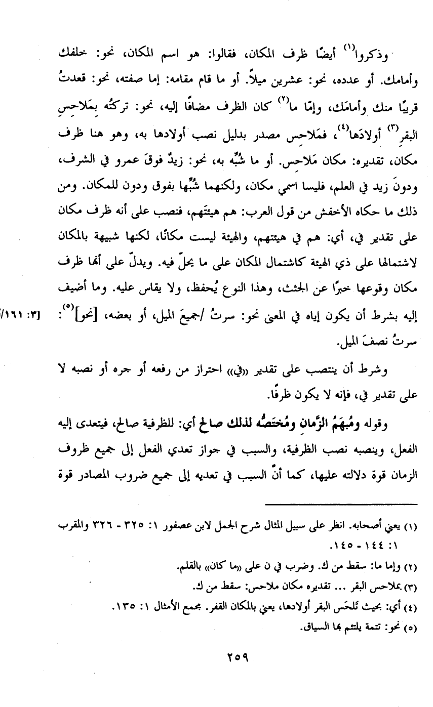وذكروا أيضاً ظرف المكان, فقالوا: هو اسم المكان, نحو: خلفك وأمامك. أو عدده, نحو: عشرين ميلاً. أو ما قام مقامه: إما صفته, نحو: قعدت قريباً منك وأمامك, وإما ما كان الظرف مضافاً إليه, نحو: تركته بملاحس البقر أولادها، فملاحس مصدر بدليل نصب أولادها به، وهو هنا ظرف مكان، تقديره: مكان ملاحس. أو ما شبه به، نحو: زيد فوق عمرو في الشرف, ودون زيد في العلم, فليسا اسمي مكان, ولكنهما شبها بفوق ودون المكان. من ذلك ما حكاه الأخفش من قول العرب: هم هيئتهم، فنصب على أنه ظرف مكان على تقدير في، أي: هم في هيئتهم، والهيئة ليست مكاناً, لكنها شبيهة بالمكان لاشتمالها على ذي الهيئة كاشتمال المكان على ما يحل فيه. ويدل على أنها ظرف مكان وقوعها خبراً عن الجثث, وهذا النوع يحفظ, ولا يقاس عليه. وما أضيف إليه بشرط أن يكون إياه في المعنى نحو: سرت /جميع الميل, أو بعضه, [نحو]: سرت نصف الميل.
