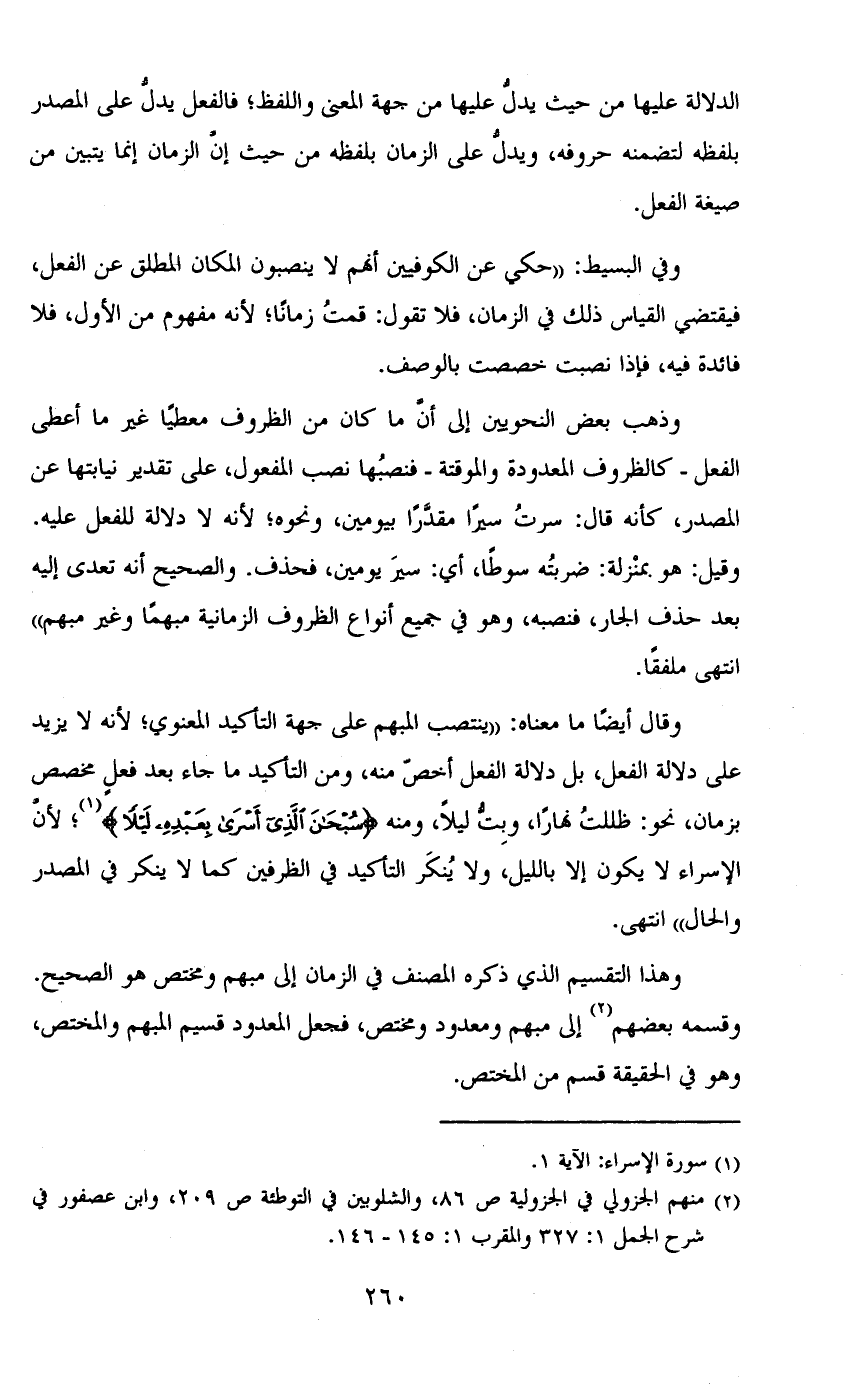 وقال أيضاً ما معناه: «ينتصب المبهم على جهة التأكيد المعنوي؛ لأنه لا يريد على دلالة الفعل، بل دلالة الفعل أخص منه، ومن التأكيد ما جاء بعد فعل مخصص بزمان, نحو: ظللت نهاراً، وبت ليلاً، ومنه {سُبْحَانَ الَّذِي أَسْرَى بِعَبْدِهِ لَيْلًا}؛ لأن الإسراء لا يكون إلا بالليل, ولا ينكر التأكيد في الظرفين كما لا ينكر في المصدر والحال» انتهى.
