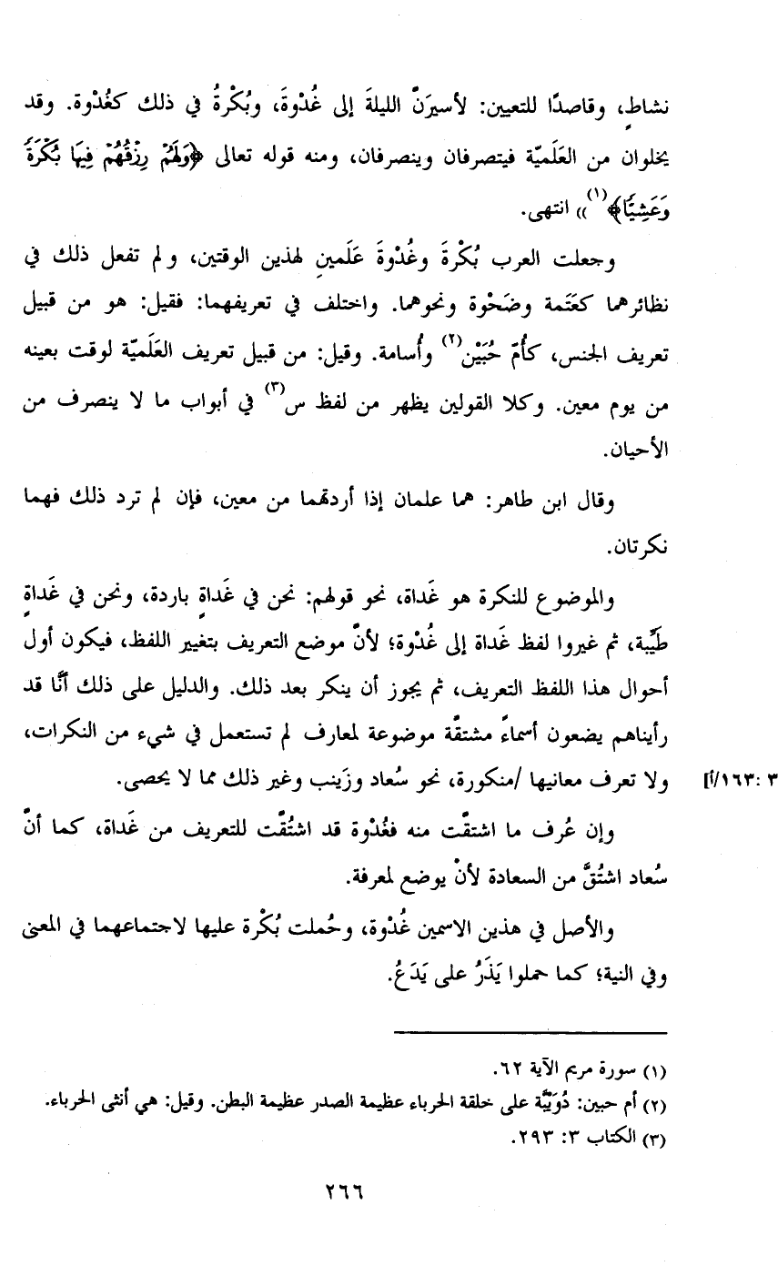 وجعلت العرب بكرة وغدوة علمين لهذين الوقتين، ولم تفعل ذلك في نظائرهما كعتمة وضحوة ونحوهما. واختلف في تعريفهما: فقيل: هو من قبيل تعريف الجنس، كأم حبين وأسامة. وقيل: من قبيل تعريف العلمية لوقت بعينه من يوم معين. وكلا القولين يظهر من لفظ س في أبواب ما لا ينصرف من الأحيان.