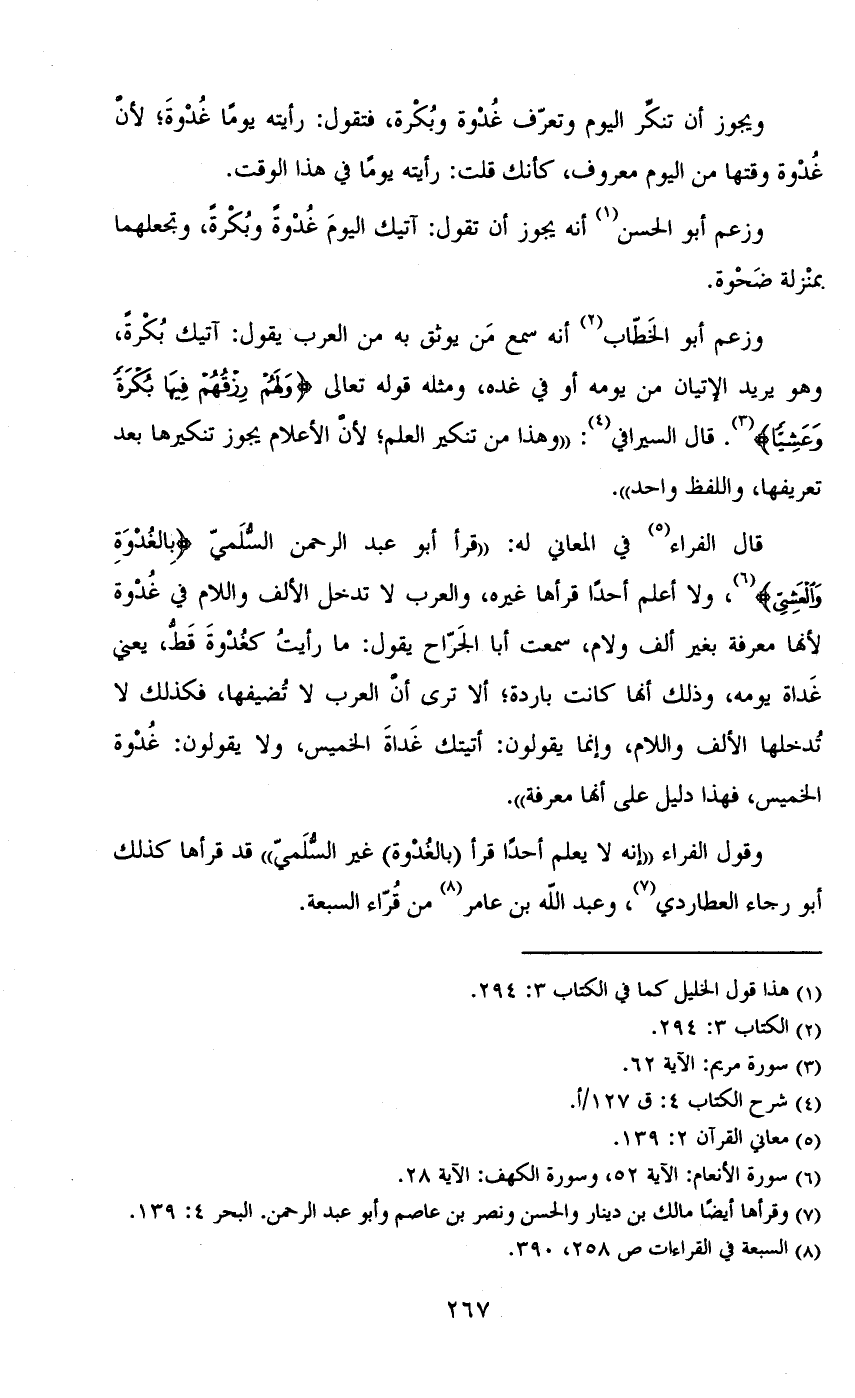 وقول الفراء «إنه لا يعلم أحداً قرأ (بالغدوة) غير السلمي» قد قرأها كذلك أبو رجاء العطاردي، وعبد الله بن عامر من قراء السبعة.