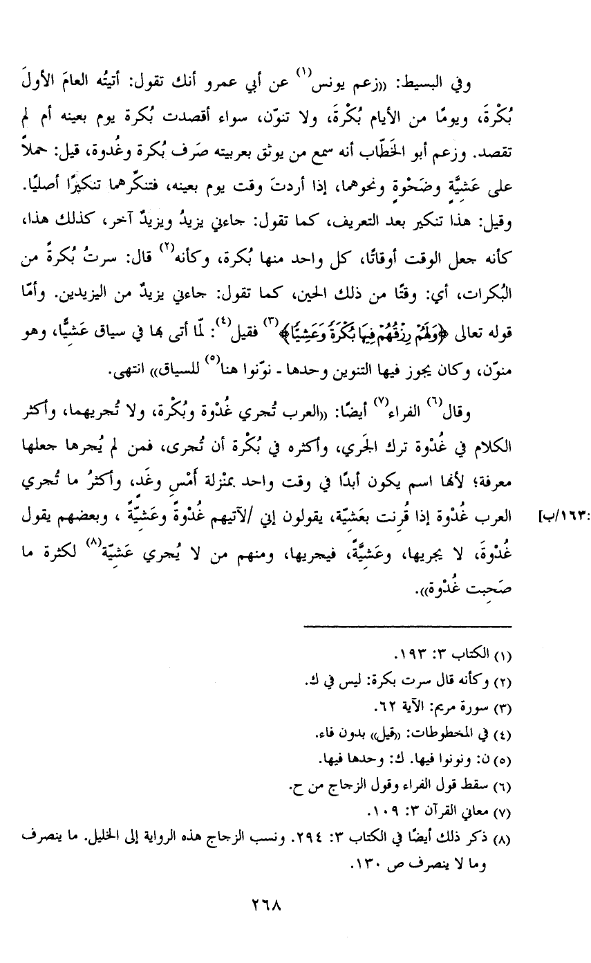 وقال الفراء أيضاً: «العرب تجري غدوة وبكرة، ولا تجريهما، وأكثر الكلام في غدوة ترك الجري، وأكثره في بكرة أن تجرى، فمن لم يجرها جعلها معرفة؛ لأنها اسم يكون أبداً في وقت واحد بمنزلة أمس وغد، وأكثر ما تجري العرب غدوة إذا قرنت بعشية، يقولون إني / لآتيهم غدوة وعشية، وبعضهم يقول غدوة، لا يجريها, وعشية, فيجريها، ومنهم من لا يجري عشية لكثرة ما صحبت غدوة».