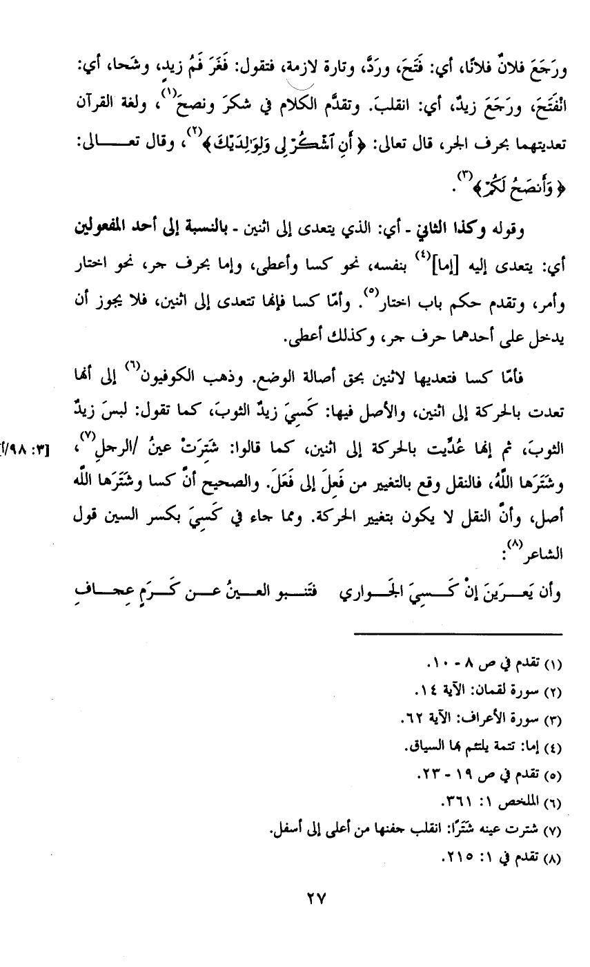 ورجع فلان فلاناً، أي: فتح، ورد، وتارة لازمة، فتقول: فغر فم زيدٍ، وشحا، أي: انفتح، ورجع زيدٌ، أي: انقلب. وتقدم الكلام في شكر ونصح، ولغة القرآن تعديتهما بحرف الجر، قال تعالى: {أَنِ اشْكُرْ لِي وَلِوَالِدَيْكَ}، وقال تعالى: {وَأَنصَحُ لَكُمْ}.