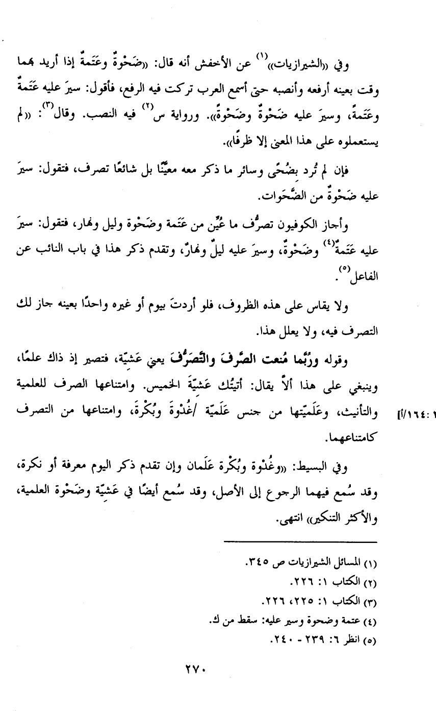وفي «الشيرازيات» عن الأخفش أنه قال: «ضحوة وعتمة إذا أريد بهما وقت بعينه أرفعه وأنصبه حتى أسمع العرب تركت فيه الرفع، فأقول: سير عليه عتمة وعتمة، وسير عليه ضحوة وضحوة». ورواية س فيه النصب. وقال: «لم يستعملوه على هذا المعنى إلا ظرفاً».