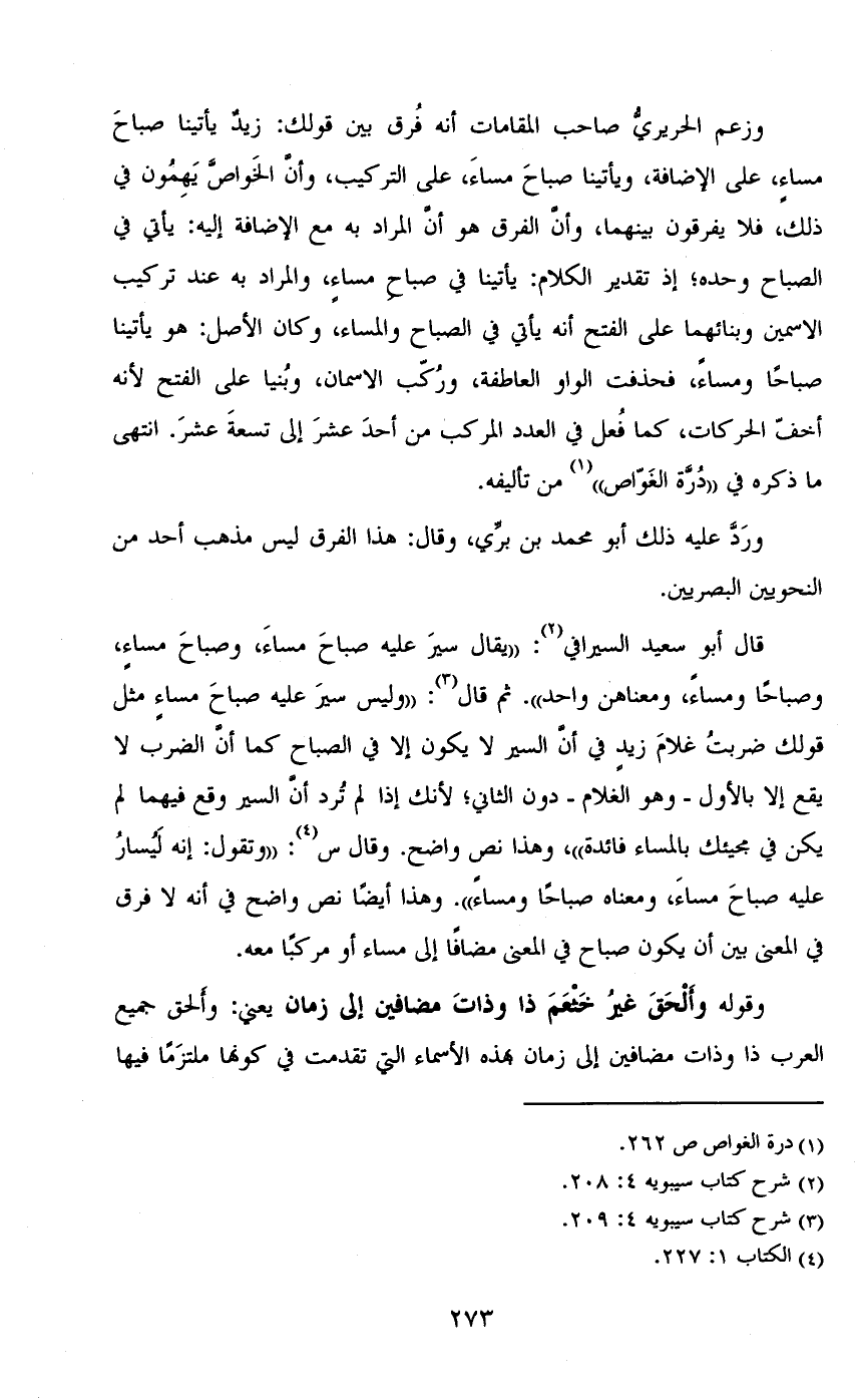 وزعم الحريري صاحب المقامات أنه فرق بين قولك: زيد يأتينا صباح مساء، على الإضافة، ويأتينا صباح مساء, على التركيب, وأن الخواص يهمون في ذلك، فلا يفرقون بينهما، وأن الفرق هو أن المراد به مع الإضافة إليه: يأتي في الصباح وحده؛ إذ تقدير الكلام: يأتينا في صباح مساء، والمراد به عند تركيب الاسمين وبنائهما على الفتح أنه يأتي في الصباح والمساء, وكان الأصل: هو يأتينا صباحاً ومساءً، فحذفت الواو العاطفة، وركب الاسمان، وبنيا على الفتح لأنه أخف الحركات، كما فعل في العدد المركب من أحد عشر إلى تسعة عشر. انتهى ما ذكره في «درة الغواص» من تأليفه.