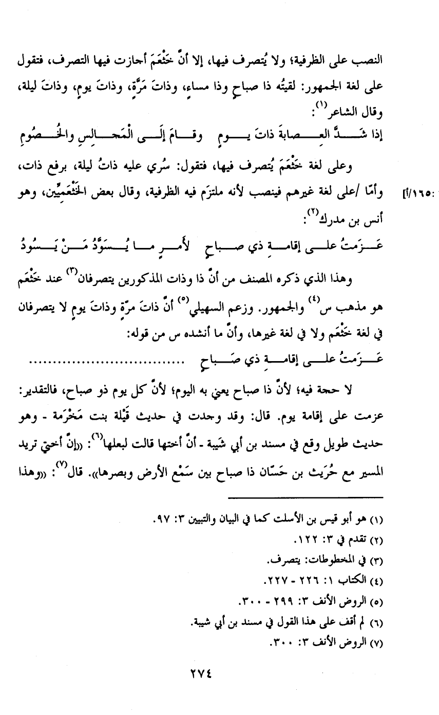 لا حجة فيه؛ لأن ذا صباح يعني به اليوم؛ لأن كل يوم ذو صباح، فالتقدير: عزمت على إقامة يوم. قال: وقد وجدت في حديث قيلة بنت مخرمة- وهو حديث طويل وقع في مسند بن أبي شيبة- أن أختها قالت لبعلها: «إن أختي تريد المسير مع حريث بن حسان ذا صباح بين سمع الأرض وبصرها». قال: «وهذا