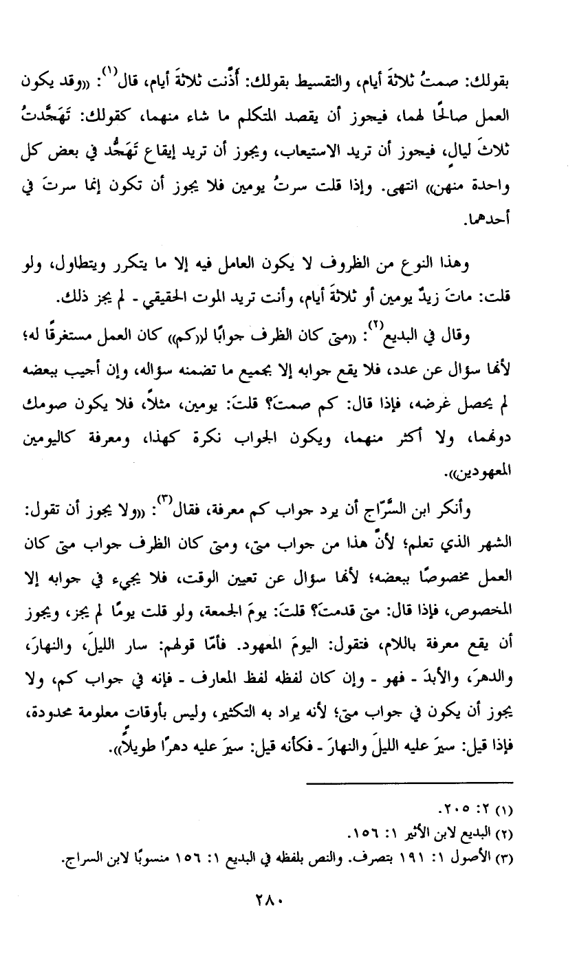 بقولك: صمت ثلاثة أيام، والتقسيط بقولك: أذنت ثلاثة أيام، قال: «وقد يكون العمل صالحاً لهما، فيجوز أن يقصد المتكلم ما شاء منهما، كقولك: تهجدت ثلاثة ليال، فيجوز أن تريد الاستيعاب، ويجوز أن تريد إيقاع تهجد في بعض كل واحدة منهن» انتهى. وإذا قلت سرت يومين فلا يجوز أن تكون إنما سرت في أحدهما.
