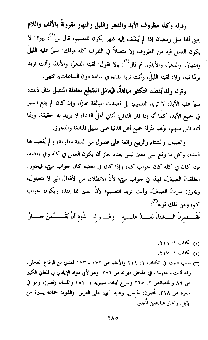 وقوله وكذا مظروف الأبد والدهر والليل والنهار مقرونة بالألف واللام يعني أنها مثل رمضان إذا لم يضف إليه شهر يكون للتعميم، قال س: «ومما لا يكون العمل فيه من الظروف إلا متصلاً في الظرف كله قولك: سير عليه الليل والنهار، والدهر، والأبد». ثم قال: «لا تقول: لقيته الدهر، والأبد، وأنت تريد يوماً فيه، ولا: لقيته الليل، وأنت تريد لقاءه في ساعة دون الساعات» انتهى.