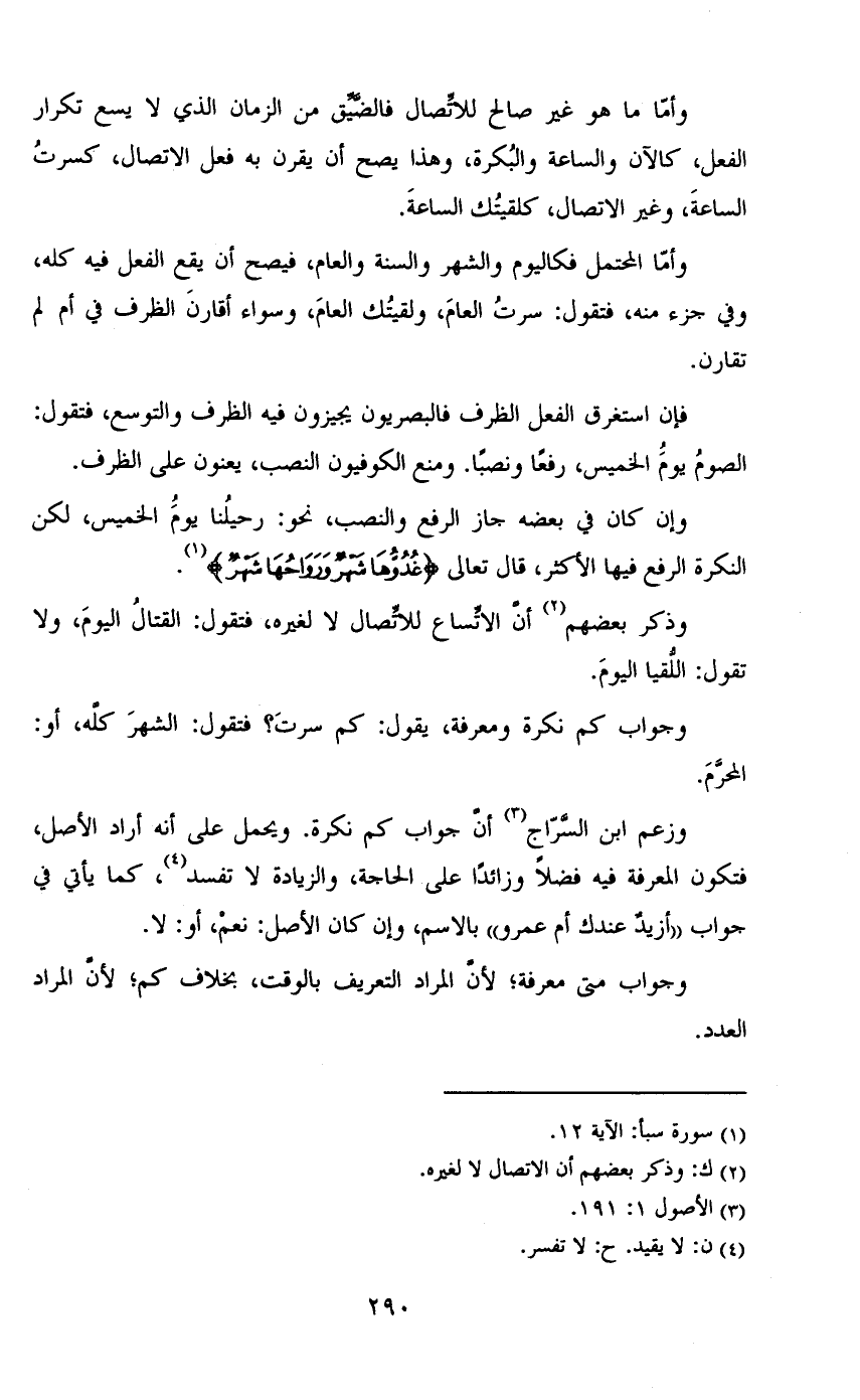 وإن كان في بعضه جاز الرفع والنصب، نحو: رحيلنا يوم الخميس، لكن النكرة الرفع فيها الأكثر، قال تعالى {غُدُوُّهَا شَهْرٌ وَرَوَاحُهَا شَهْرٌ}.