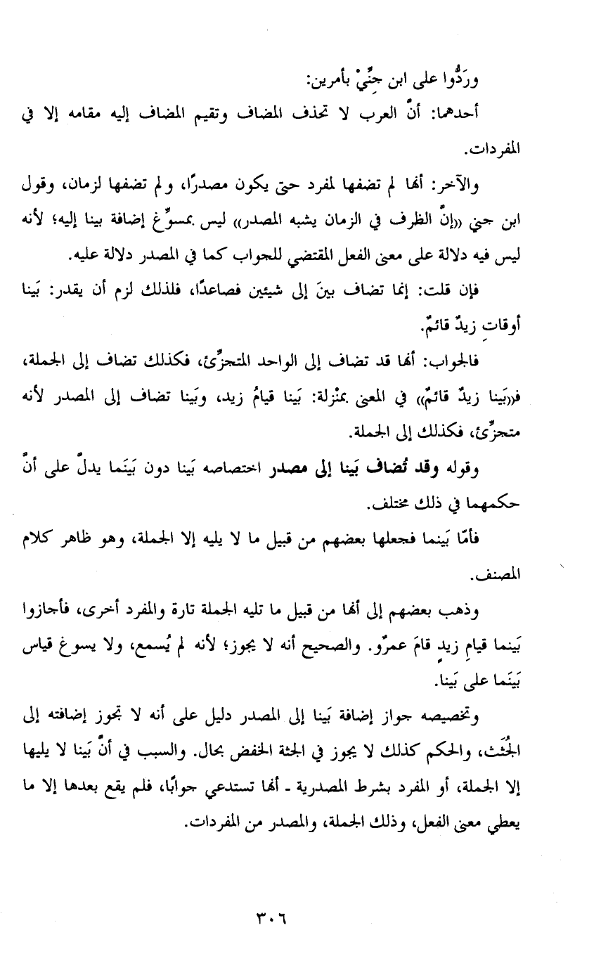 والآخر: أنها لم تضفها لمفرد حتى يكون مصدراً، ولم تضفها لزمان، وقول ابن جني «إنّ الظرف في الزمان يشبه المصدر». ليس بمسوِّغ إضافة بينا إليه؛ لأنه ليس فيه دلالة علي معني الفعل المقتضي للجواب كما في المصدر دلالة عليه.
