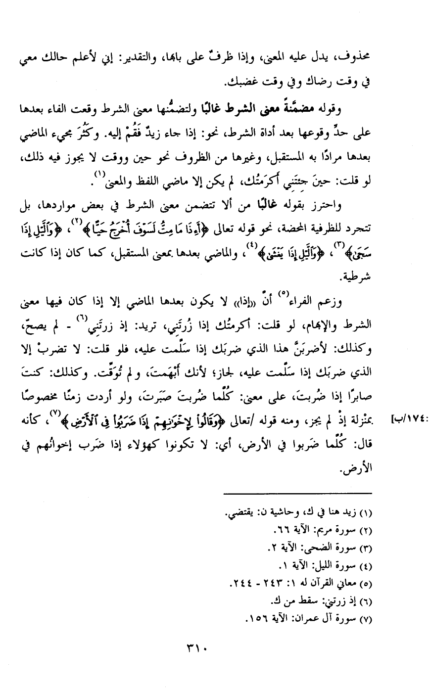 وقوله مضمَّنةً معني الشرط غالباً ولتضمُّنها معني الشرط. وقعت الفاء بعدها علي حدٍّ وقوعها بعد أداة الشرط، نحو: إذا جاء زيدٌ فَقُمْ إليه. وكَثُرَ مجيء الماضي بعدها مراداً به المستقبل، وغيرها من الظروف نحو حين ووقت لا يجوز فيه ذلك، لو قلت: حينَ جِئتَنِي أَكرَمتُك، لم يكن إلا ماضي اللفظ والمعني.