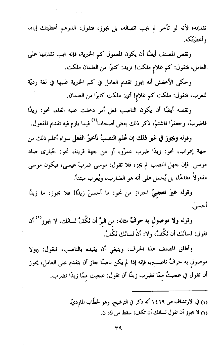 وقوله ويجوز في غير ذلك إن عُلم النصب تأخير الفعل سواء أعلم ذلك من جهة إعراب، نحو: زيداً ضرب عمرو، أو من جهة قرينة، نحو: حُبارى صاد موسى. فإن جهل النصب لم يجز، فلا تقول: موسى ضرب عيسى، فيكون موسى مفعولاً مقدماً، بل يُحمل على أنه هو الضارب، ويُعرب مبتدأ.