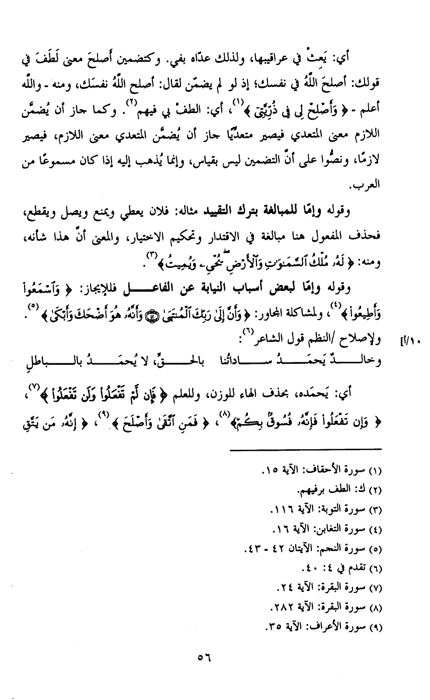 أي: يعث في عراقيبها، ولذلك عداه بفي. وكتضمين أصلح معنى لطف في قولك: أصلح الله في نفسك؛ إذ لو لم يضمن لقال: أصلح الله نفسك، ومنه- والله أعلم- {وَأَصْلِحْ لِي فِي ذُرِّيَّتِي}، أي: الطف بي فيهم. وكما جاز أن يضمن اللازم معنى المتعدي فيصير متعدياً جاز أن يضمن المتعدي معنى اللازم، فيصير لازماً، ونصوا على أن التضمين ليس بقياس، وإنما يذهب إليه إذا كان مسموعاً من العرب.