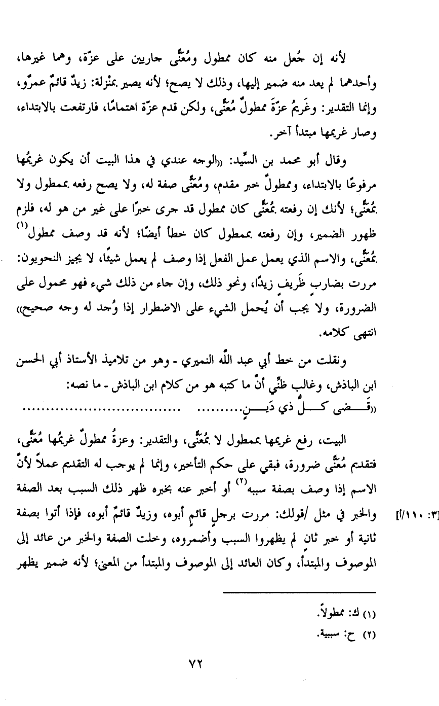 البيت؛ رفع غريمها بممطول لا بمعنى، والتقدير: وعزة ممطول غريمها معنى، فتقديم معنى ضرورة، فبقى على حكم التأخير، وإنما لم يوجب له التقديم عملاً لأن الاسم إذا وصف بصفة سببه أو أخبر عنه بخيره ظهر ذلك السبب بعد الصفة والخبر في مثل/ قولك: مررت برجل قائم أبوه، وزيد قائم أبوه، فإذا أتوا بصفة ثانية أو خبر ثان لم يظهروا السبب وأضمروه، وخلت الصفة والخبر من عائد إلى الموصوف والمبتدأ، وكان العائد إلى الموصوف والمبتدأ من المعنى؛ لأنه ضمير يظهر