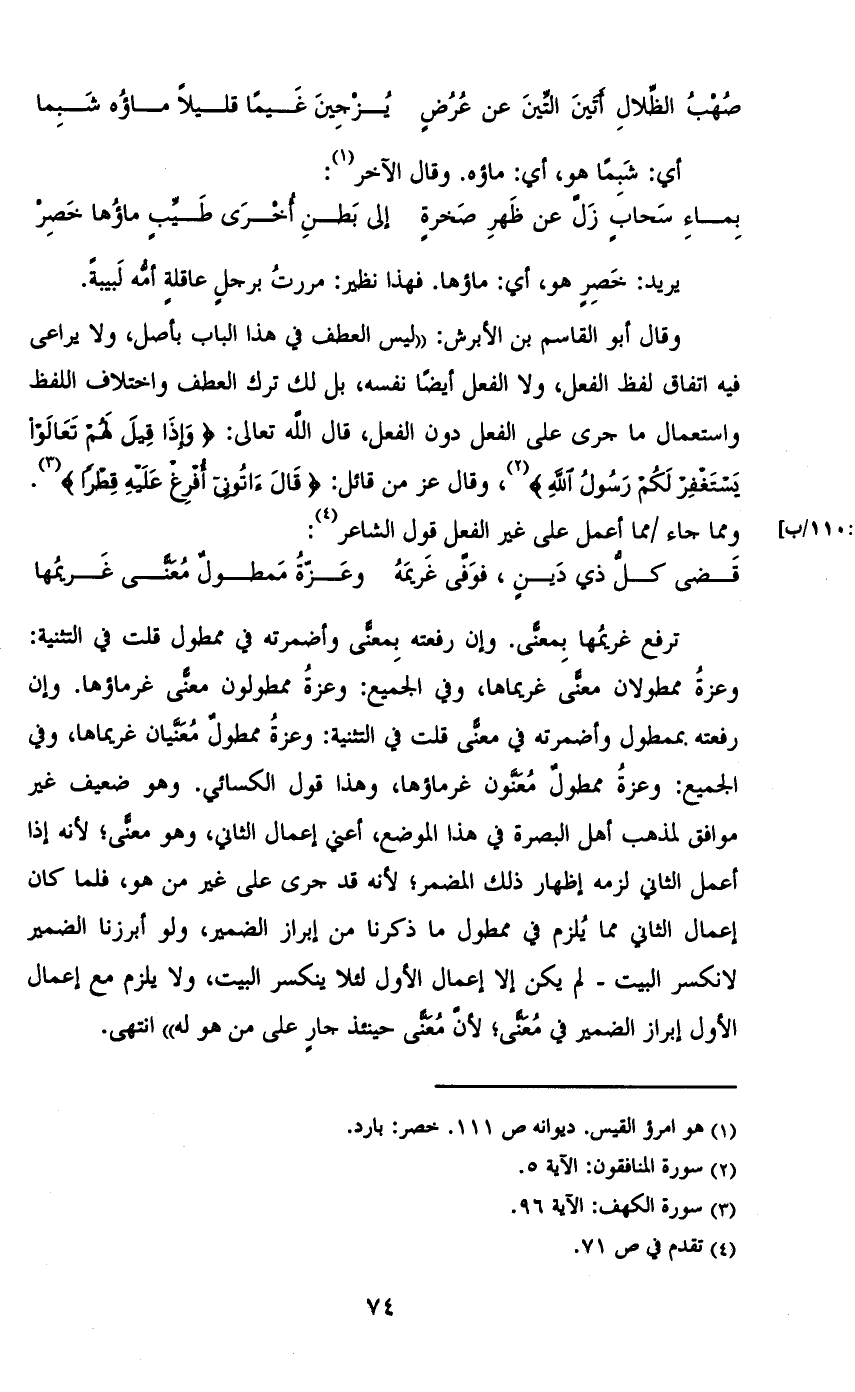 وقال أبو القاسم بن الأبرش: "ليس العطف في هذا الباب بأصل، ولا يراعى فيه اتفاق لفظ الفعل، ولا الفعل أيضًا نفسه، بل لك ترك العطف واختلاف اللفظ واستعمال ما جرى على الفعل دون الفعل، قال الله تعالى: {وَإِذَا قِيلَ لَهُمْ تَعَالَوْا يَسْتَغْفِرْ لَكُمْ رَسُولُ اللَّهِ}، وقال عز من قائل: {قَالَ آتُونِي أُفْرِغْ عَلَيْهِ قِطْرًا}. ومما جاء/ مما أعمل على غير الفعل قول الشاعر: