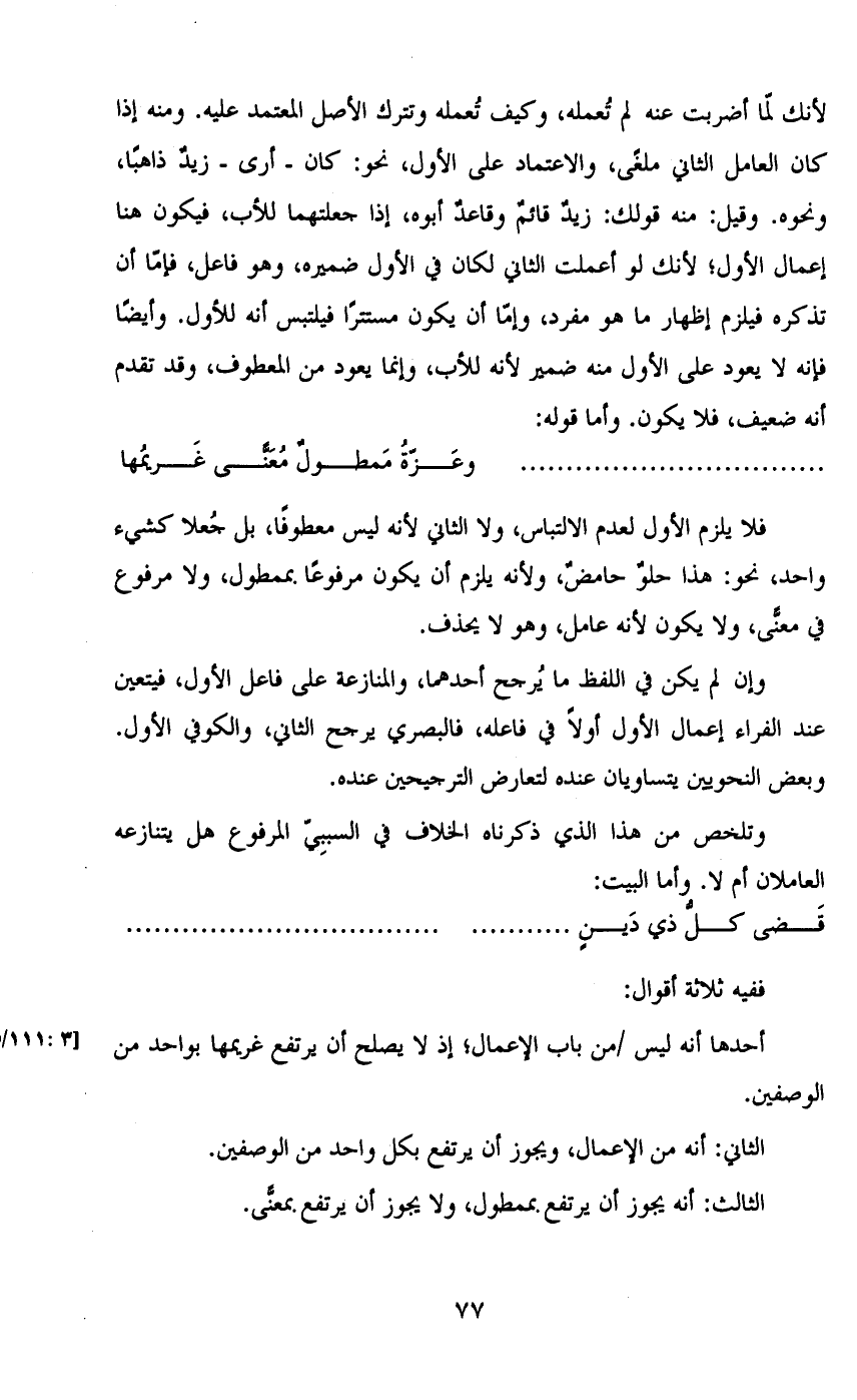 وإن لم يكن في اللفظ ما يرجح أحدهما، والمنازعة على فاعل الأول، فيتعين عند الفراء إعمال الأول أولاً في فاعله، فالبصري يرجح الثاني، والكوفي الأول. وبعض النحويين يتساويان عنده لتعارض الترجيجين عنده.