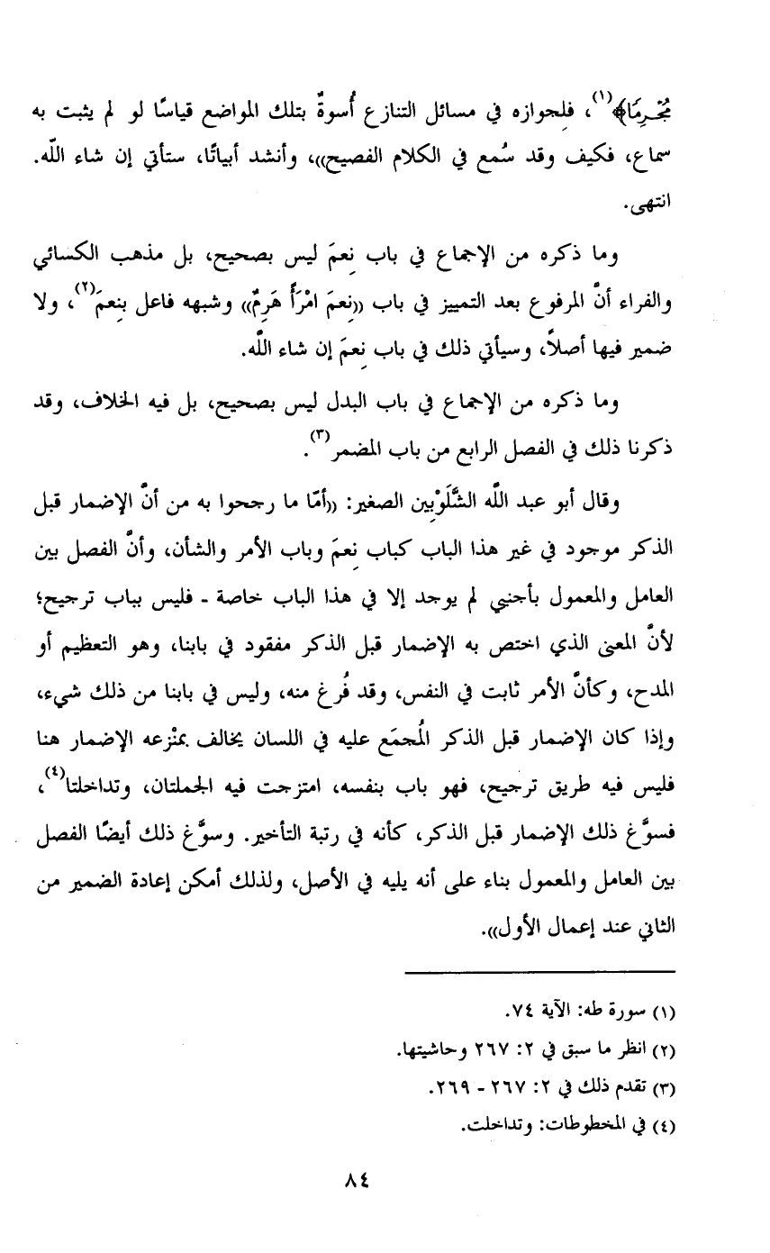وقال أبو عبد الله الشلويين الصغير: "أما ما رجحوا به من أن الإضمار قبل الذكر موجود في غير هذا الباب كباب نعم وباب الأمر والشأن، وأن الفصل بين العامل والمعمول بأجنبي لم يوجد إلا في هذا الباب خاصة- فليس بباب ترجيح؛ لأن المعنى الذي اختص به الإضمار قبل الذكر مفقود في بابنا، وهو التعظيم أو المدح، وكأن الأمر ثابت في النفس، وقد فرغ منه، وليس في بابنا من ذلك شيء، وإذا كان الإضمار قبل الذكر المجمع عليه في اللسان يخالف بمنزعه الإضمار هنا فليس فيه طريق ترجيح، فهو باب بنفسه، امتزجت فيه الجملتان، وتداخلتا، فسوغ ذلك الإضمار قبل الذكر، كأنه في رتبة التأخير. وسوغ ذلك أيضا الفصل بين العامل والمعمول بناء على أنه يليه في الأصل، ولذلك أمكن إعادة الضمير من الثاني عند إعمال الأول".