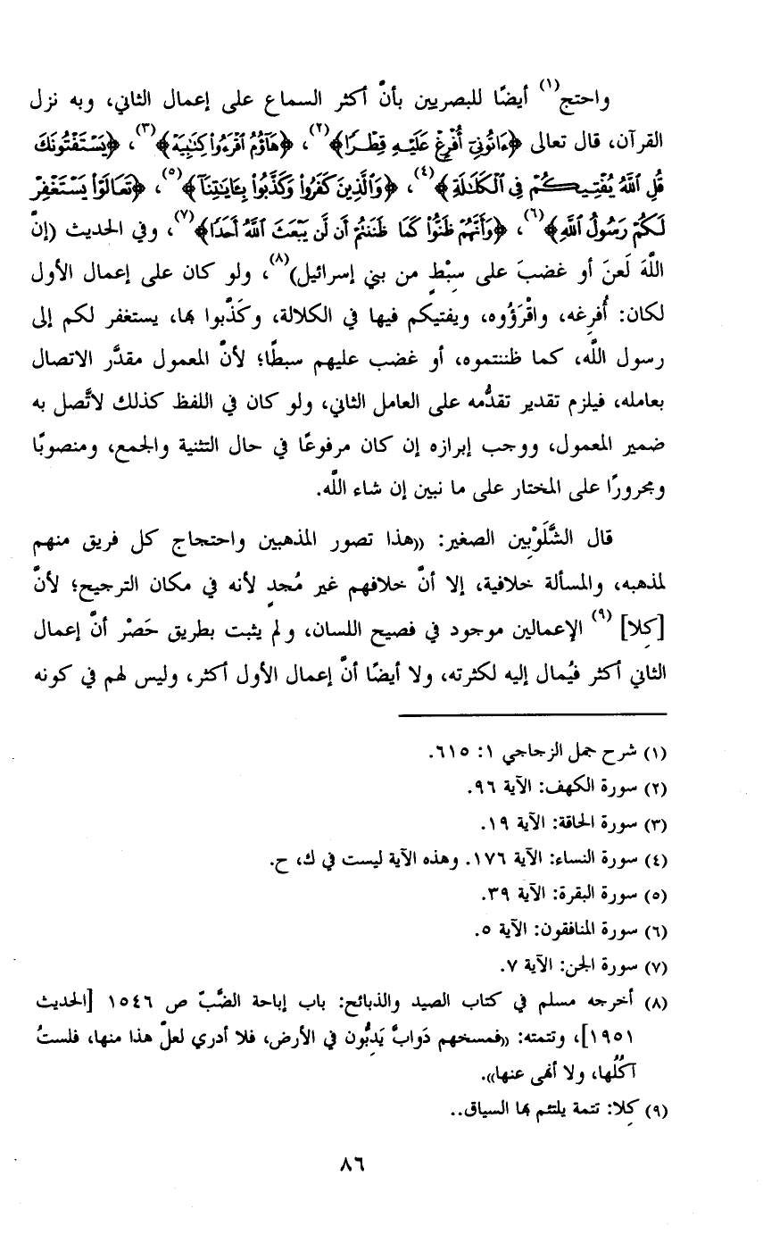 واحتج أيضًا للبصريين بأن أكثر السماع على إعمال الثاني، وبه نزل القرآن، قال تعالى {آتُونِي أُفْرِغْ عَلَيْهِ قِطْرًا}، {هَاؤُمُ اقْرَءُوا كِتَابِيَهْ}، {يَسْتَفْتُونَكَ قُلِ اللَّهُ يُفْتِيكُمْ فِي الْكَلالَةِ}، {وَالَّذِينَ كَفَرُوا وَكَذَّبُوا بِآيَاتِنَا}، {تَعَالَوْا يَسْتَغْفِرْ لَكُمْ رَسُولُ اللَّهِ}، {وَأَنَّهُمْ ظَنُّوا كَمَا ظَنَنتُمْ أَنْ لَنْ يَبْعَثَ اللَّهُ أَحَدًا}، وفي الحديث (إن الله لعن أو غضب على سبط من بني إسرائيل)، ولو كان على إعمال الأول لكان: أفرغه، واقرؤوه، ويفتيكم فيها في الكلالة، وكذبوا بها، يستغفر لكم إلى رسول الله، كما ظننتموه، أو غضب عليهم سبطاً؛ لأن المعمول مقدر الاتصال بعامله، فيلزم تقدير تقدمه على العامل الثاني، ولو كان في اللفظ كذلك لاتصل به ضمير المعمول، ووجبإبرازه إن كان مرفوعًا في حال التثنية والجمع، ومنصوبًا ومجرورًا على المختار على ما نبين إن شاء الله.