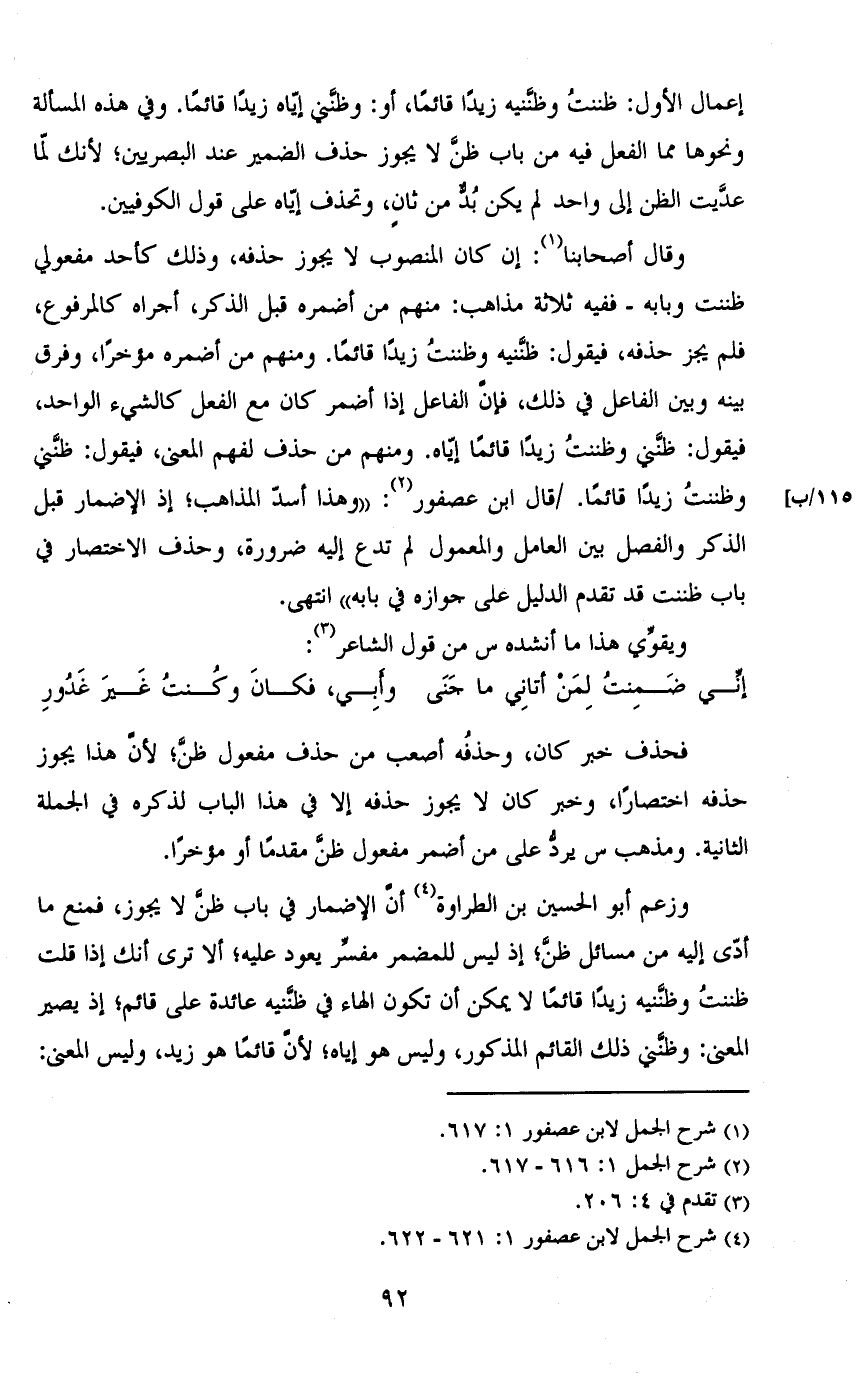 وزعم أبو الحسين بن الطراوة أن الإضمار في باب ظن لا يجوز، فمنع ما أدي إليه من مسائل ظن؛ إذ ليس للمضمر مفسر يعود عليه؛ ألا ترى أنك إذا قلت ظننت وظننيه زيدًا قائمًا لا يمكن أن تكون الهاء في ظننيه عائدة على قائم؛ إذ يصير المعنى: وظنني ذلك القائم المذكور، وليس هو إياه؛ لأن قائمًا هو زيد، وليس المعنى: